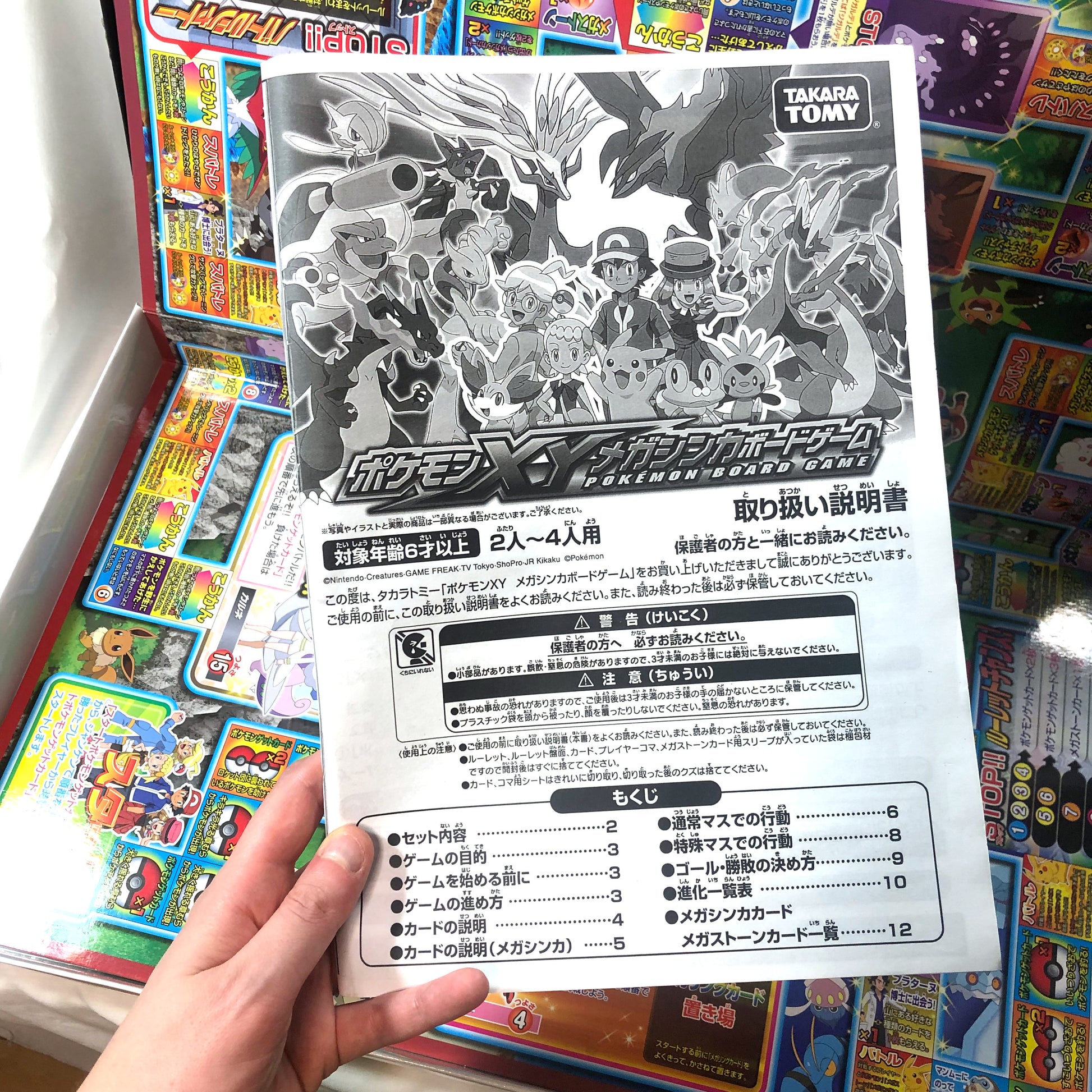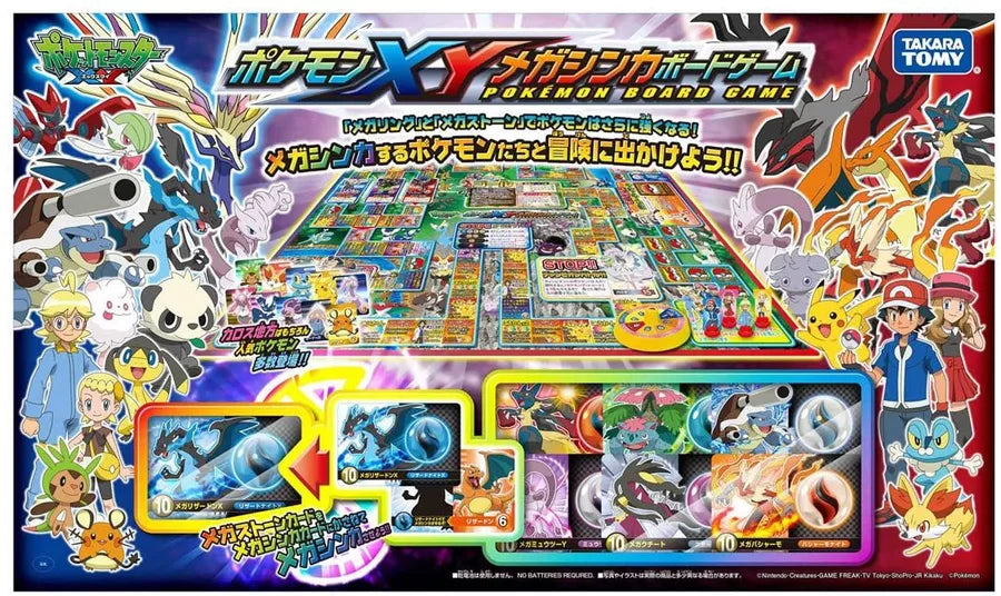 Pokemon XY Mega Evolution - ポケモンXYメガシンカボードゲーム is a board game from Takara Tomy. The players uses a spinner that gives players move points. A player then move his/her a creature on the board and read the text on the spot they land on, or move a hero to get upgrades. There are also different paths to take. First hero to the goal is the winner. (Quote from Board Game Geeks site)