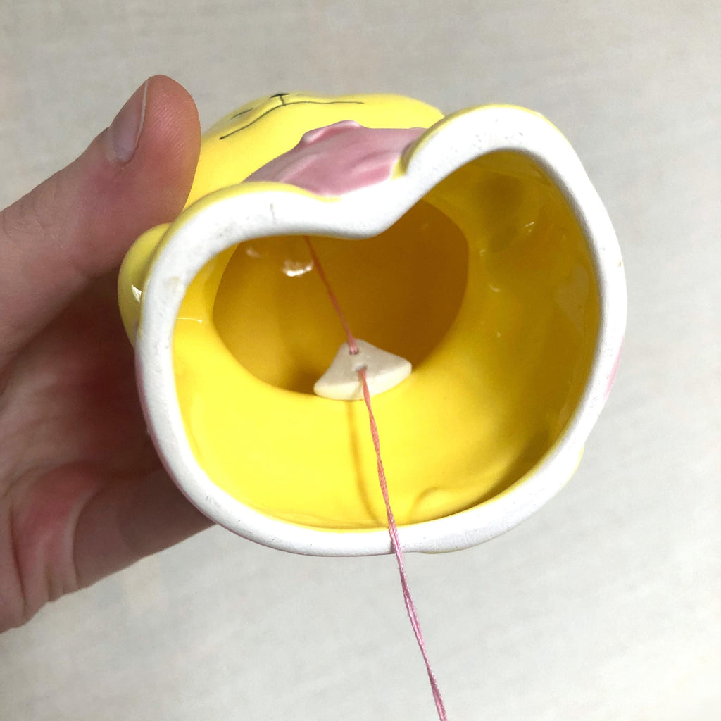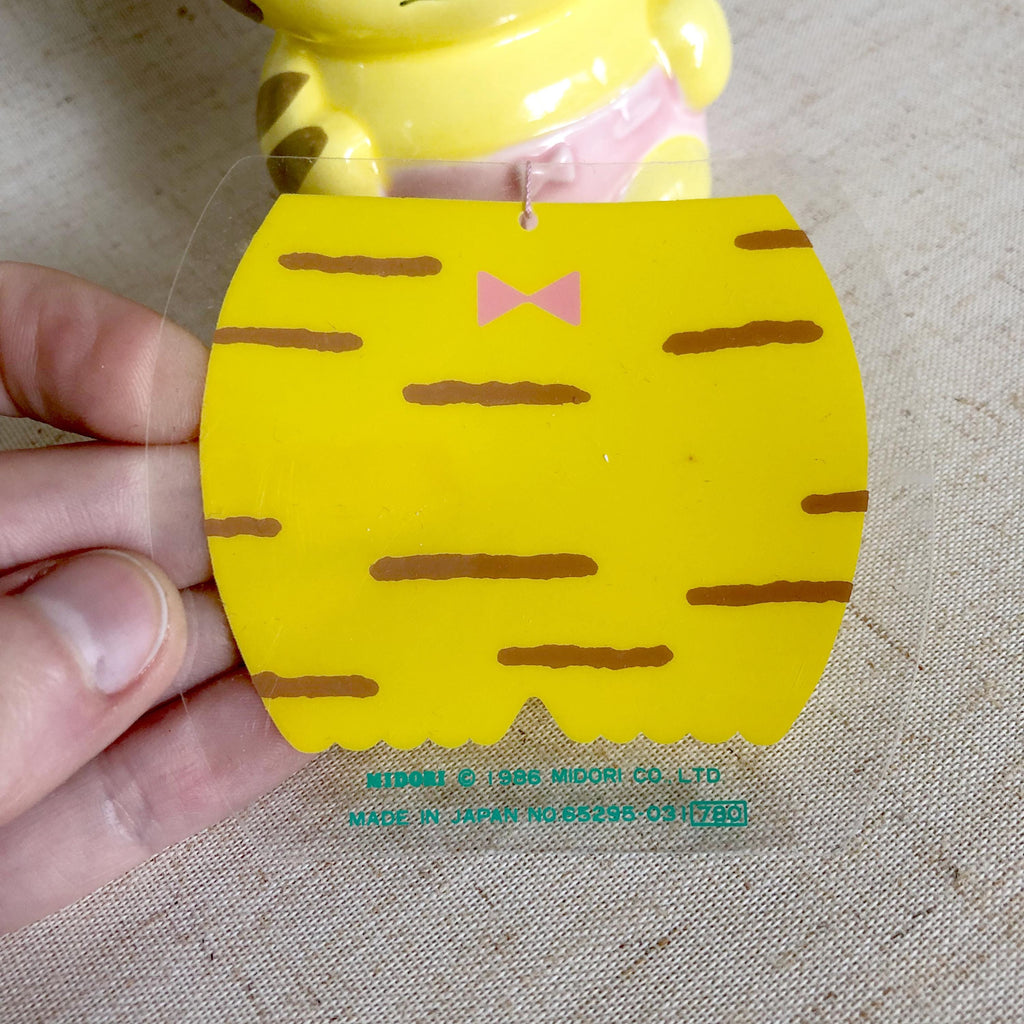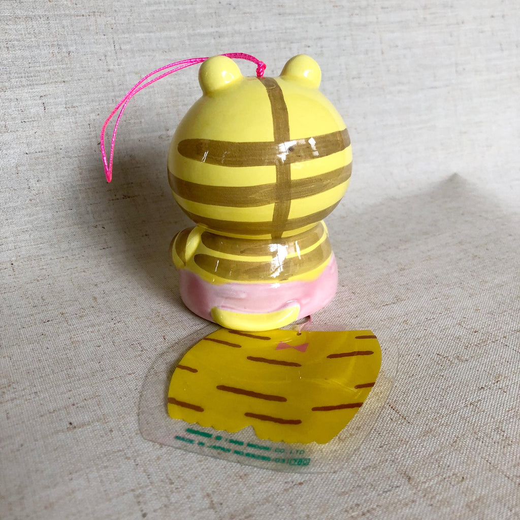 A small ceramic wind chime in a comical shape. 80s style tiger wearing pink undies seems to be really upset. The wind catching bit is in the shape of striped pants.