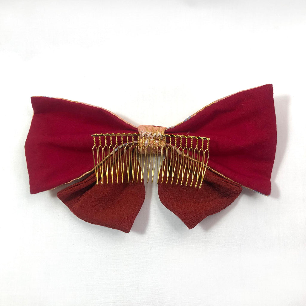 The bow is made of jacquard fabric. The top part is light pink, with various golden motifs. The bottom part is red. In the middle, there is a short decorative cord in pink and red shades. On the back there is a small wire comb, to pin the ornament in the hair.