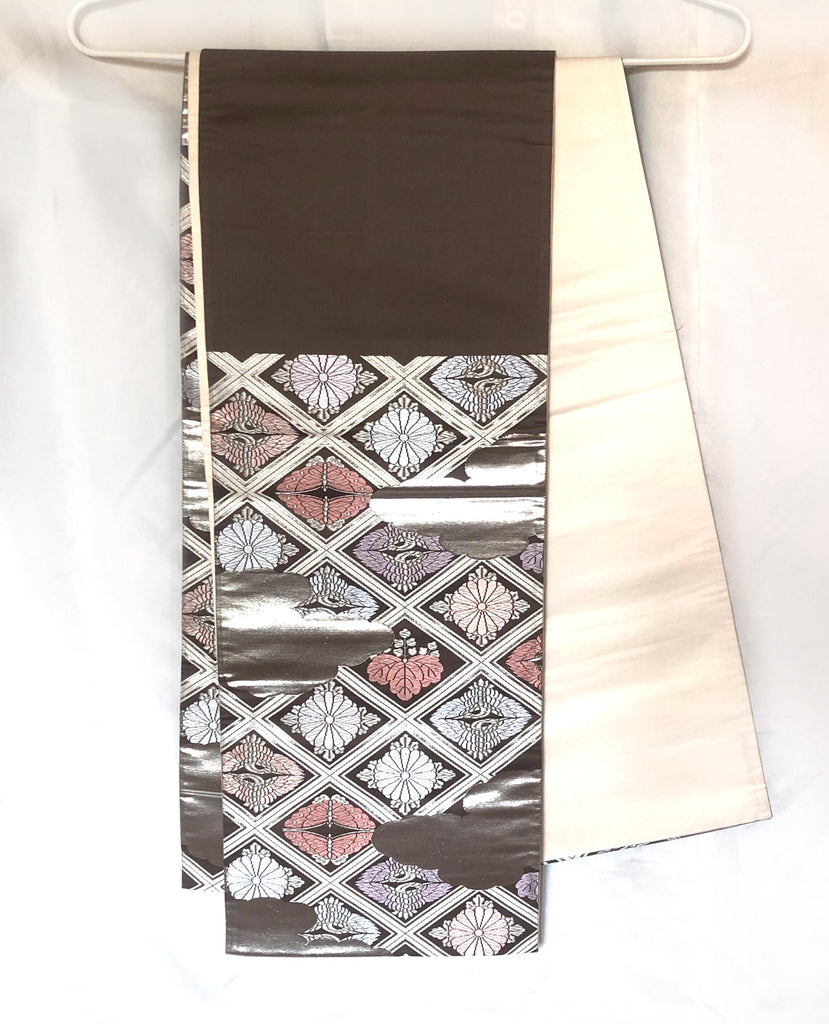 Fukuro obi - dusty pastel and silver family crests pattern