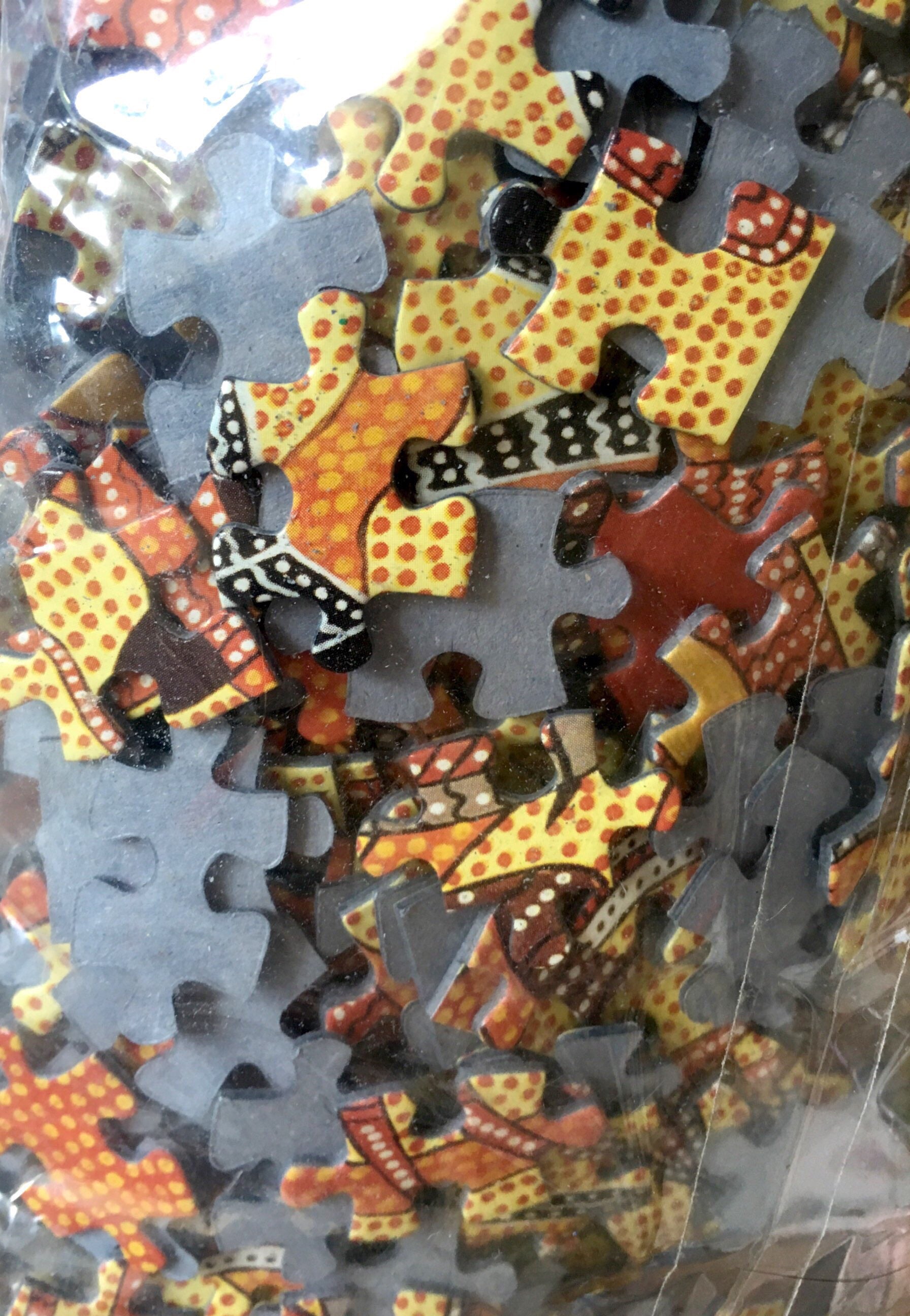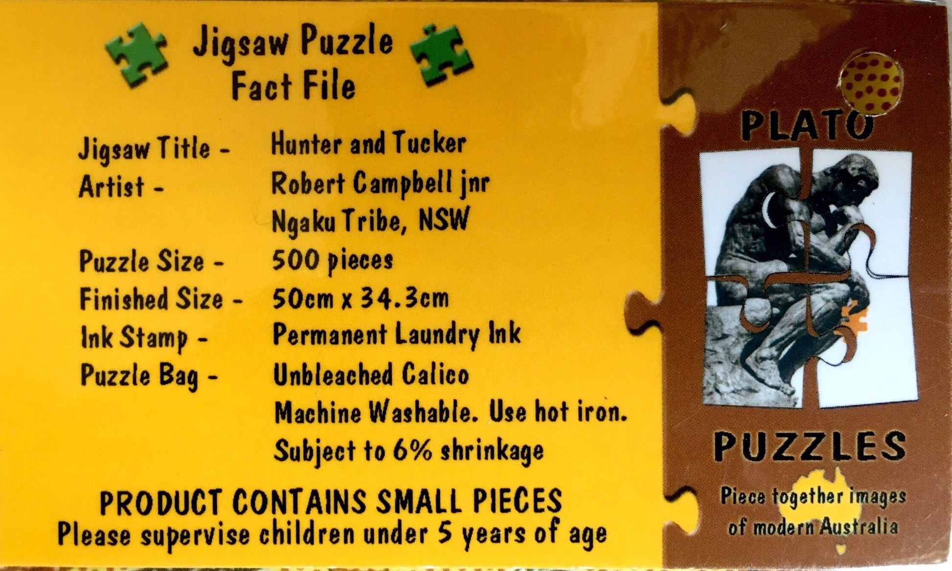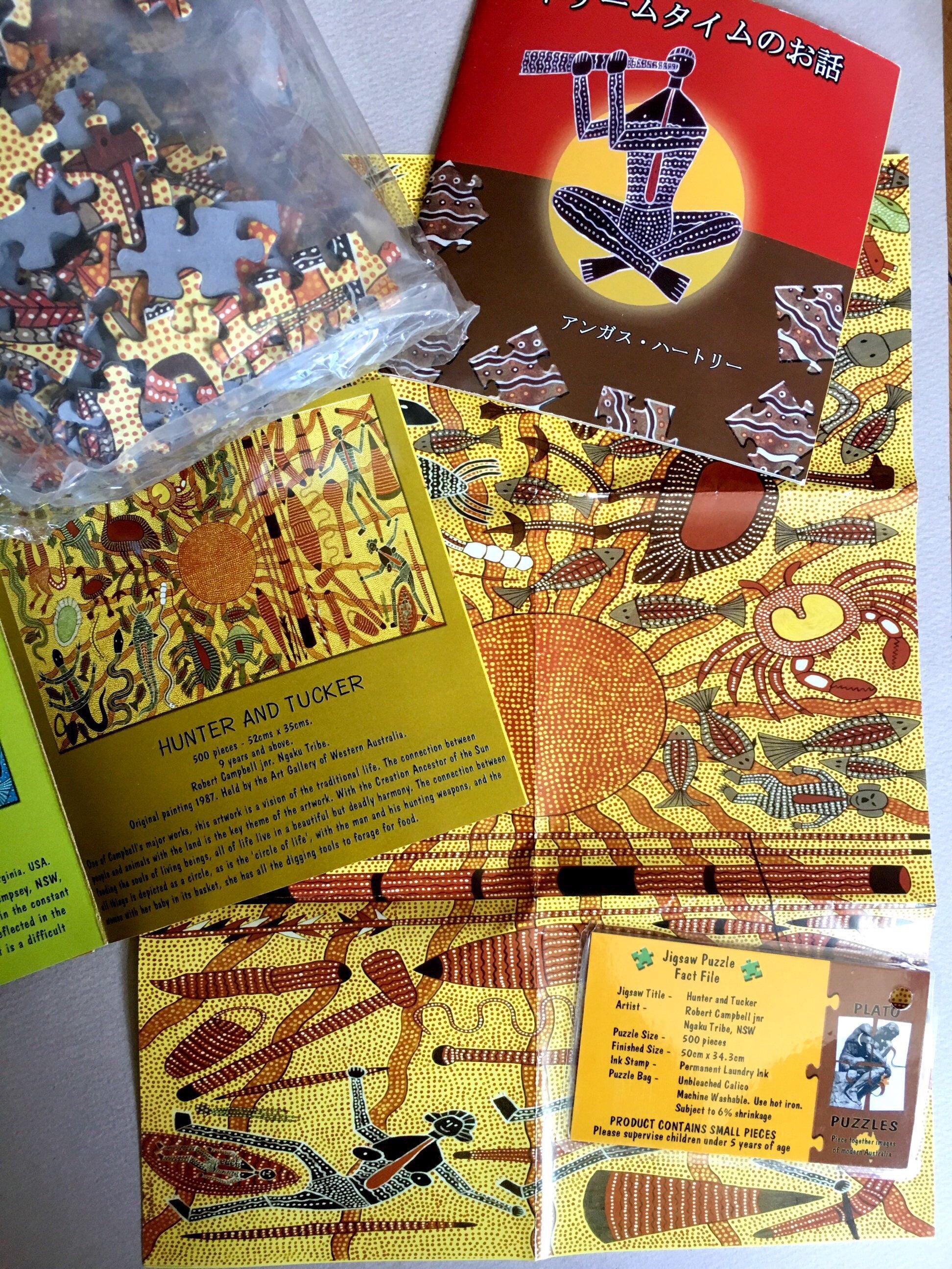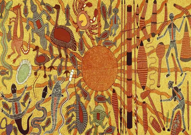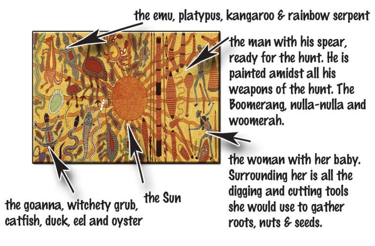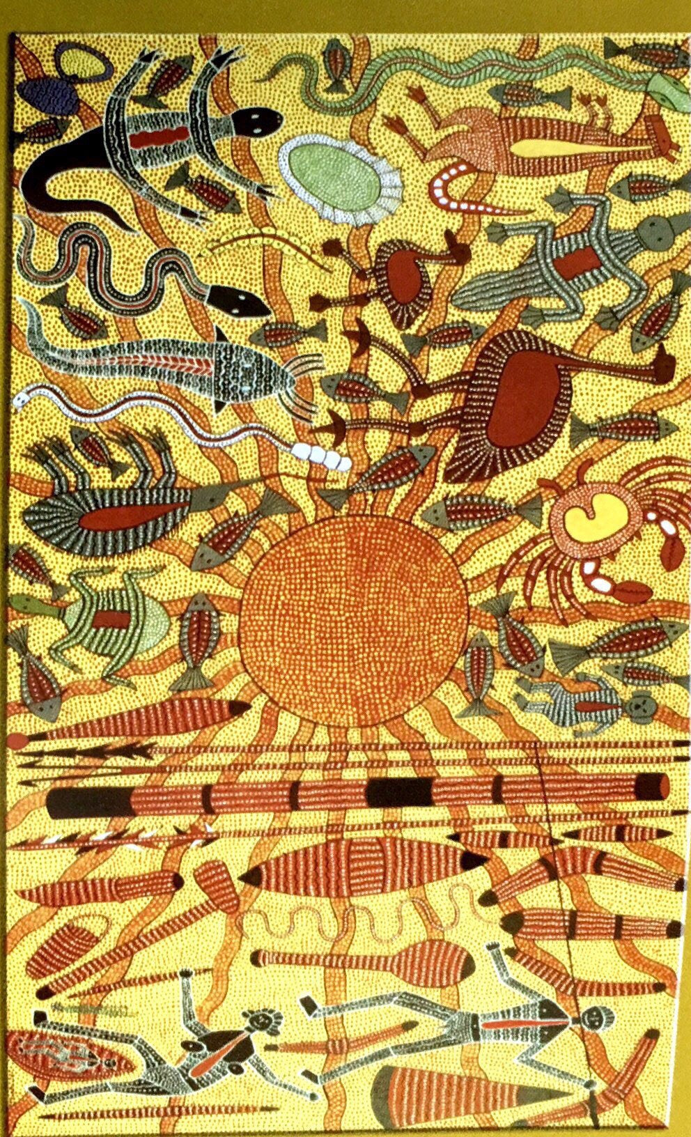 This artwork is not just a vibrant illustration of one of the unique aboriginal contributions to Australian culture, but a celebration of life in Australia. The strong yellow ochres symbolise our sun-drenched land. Robert’s unique portrayal of the sun feeding energy, or life force, into all creatures reflect the strong character of the Australian Wildlife. From the life-force grows the spirit of the Creation Ancestors inside all living things. Robert portrays our Ancestors as like ‘bow-ties’ inside the people and animals living ‘the Dreaming’. On the right hand side of the artwork is the human world, the left hand side represents our natural world. Robert portrays traditional aboriginal life, with the woman and baby on the bottom right, with all the digging tools she would take with her on her daily forage for food, or ‘tucker’. Above this is the male aboriginal with all the tools he takes with him on his daily hunt for meat. He is the ‘hunter’. Together the woman and man become representative of the ‘Hunter & Tucker’. On the left hand side of the artwork Robert captures all the chief animals created by the Ancestors in their roaming of the world. The kangaroo, (warrior Dreaming), the emu, goanna, rainbow serpent, cat fish, turtle, koala, crab, platypus, shellfish, witchety-grub, sea worm and eel.
