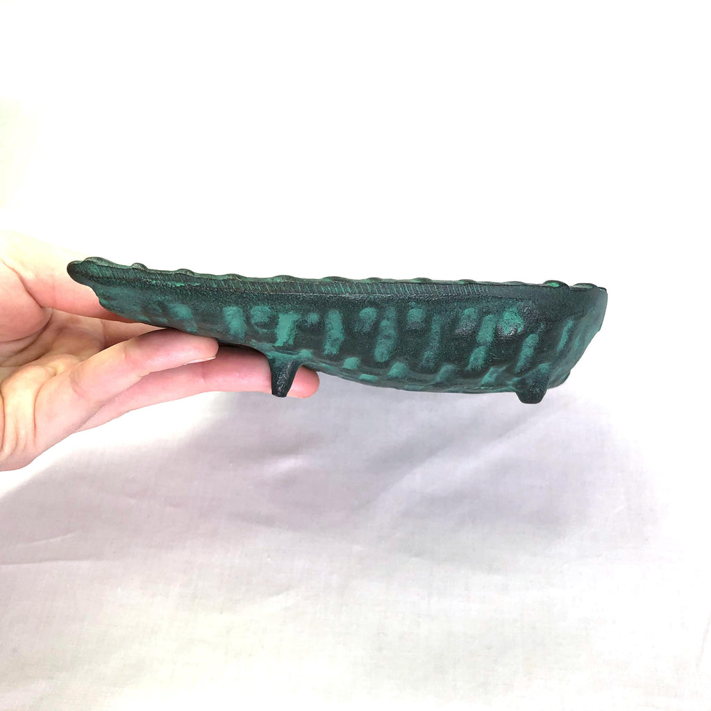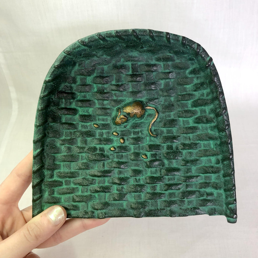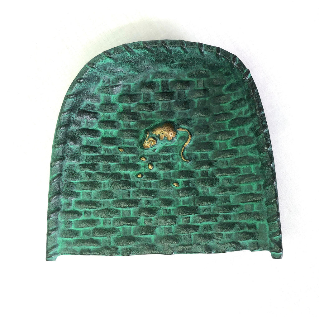 The dish is treated with a patina to achieve a pleasant green color; the mouse and grains are golden.