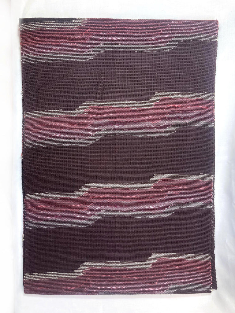 A lightweight Nagoya obi with an abstract pattern in matching shades. The fabric is in a dark, muted purple color; it appears almost brown in some light. Most of the length is decorated with pink and white zigzag-like stripes.