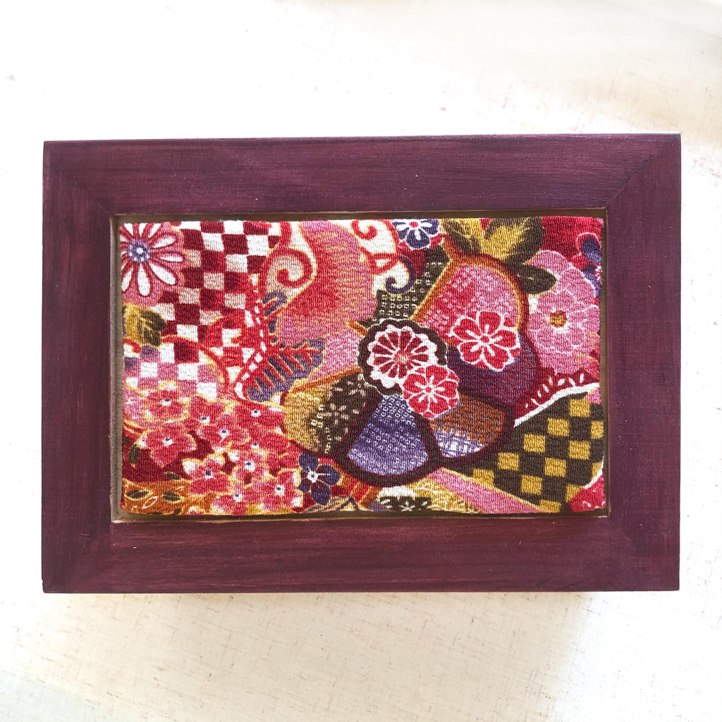 It is painted in wine red and ochre shades. The lid is decorated with cushioned crêpe fabric, depicting colorful flowers and geometric patterns.