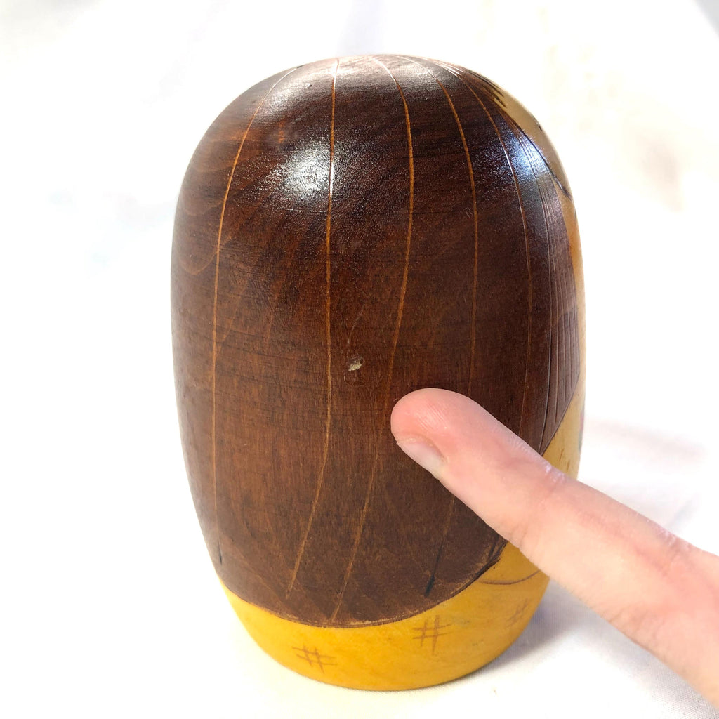 There is a small chip in the wood on the back of the doll. Please check the photos for the details.