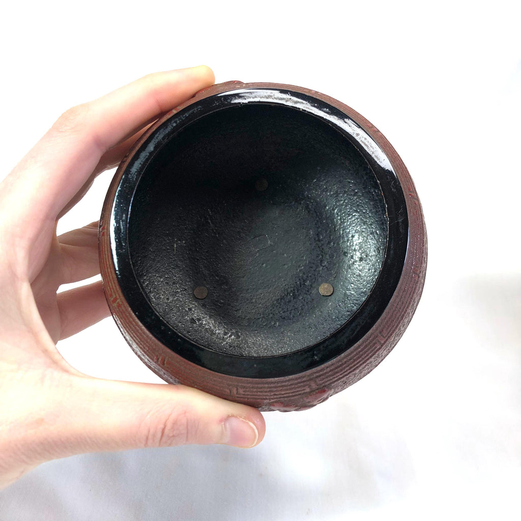 A miniature portable Japanese hearth/ash holder, made of cast iron. The regular sized ones are designed to contain ash and embers, used to warm up the environment and keep a teapot warm. This small one can serve as a unique ashtray. It can also be used to burn mosquito coils or incense cones.