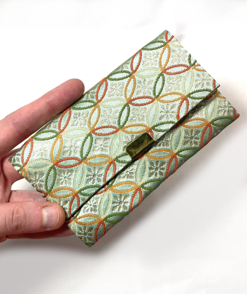 The smaller pouch is in a light, mint green shade, with the traditional "seven treasures" circular patten. It's small, about a card size. It closes with a metal snap button.