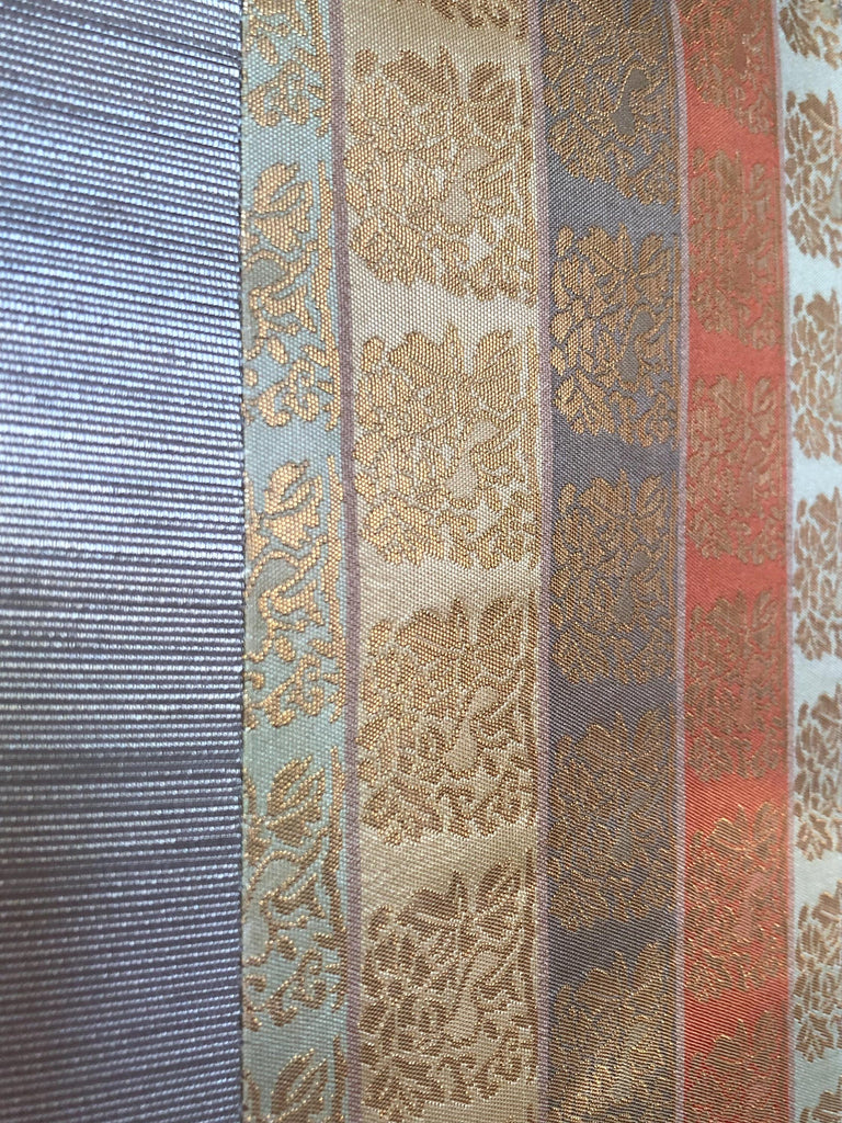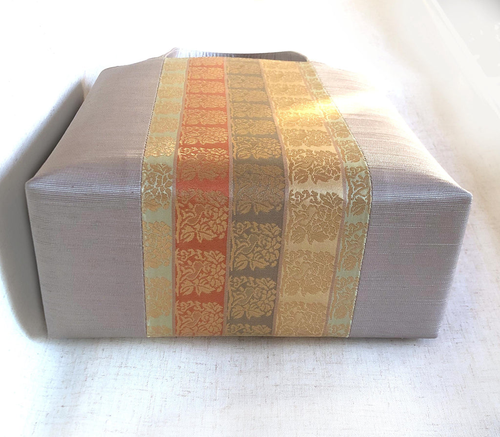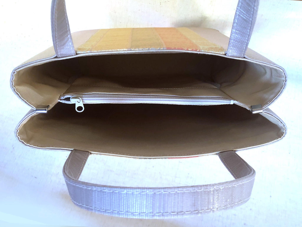 An elegant tote bag with short handles. The sides are made of textured, light gray fabric. It has a bit of sheen to it. The middle is decorated with a pastel jacquard stripe with dolden accents.