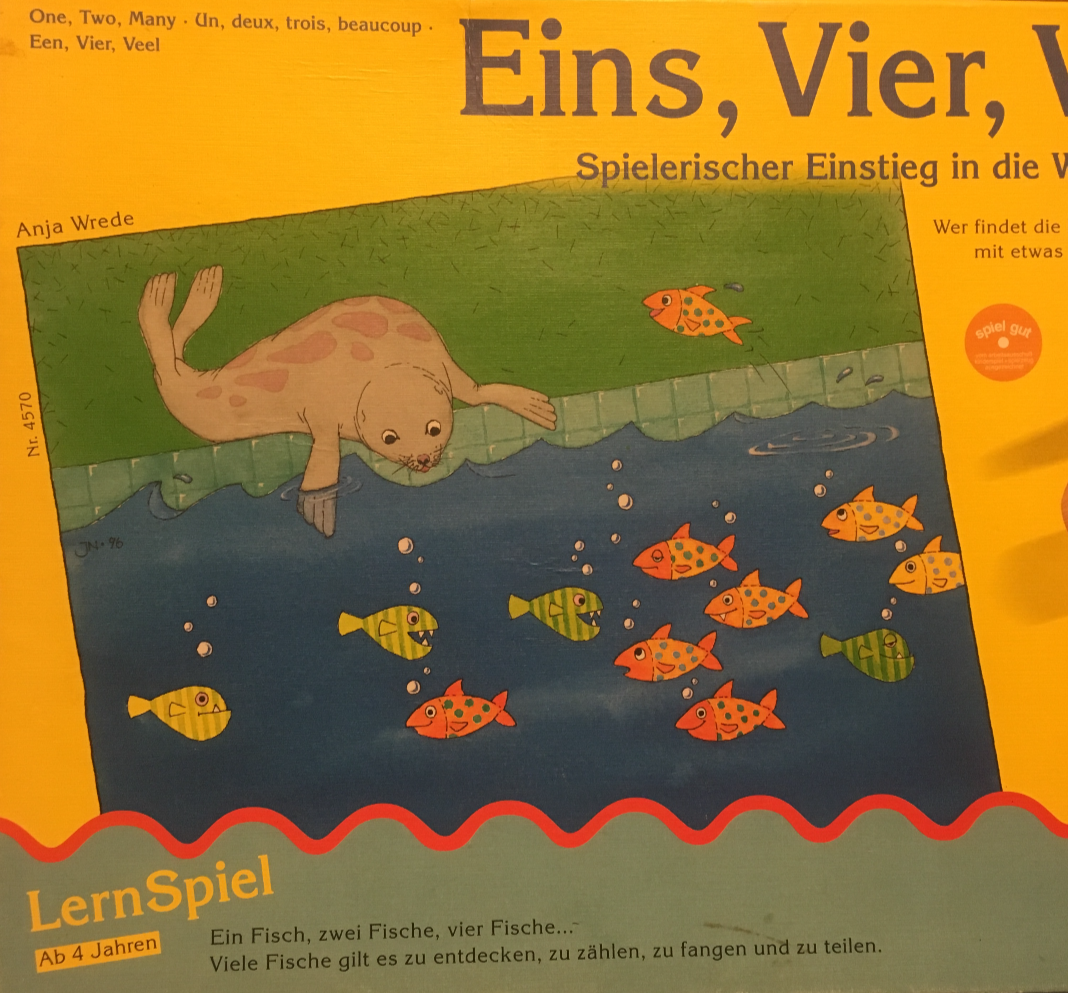 One, two-- a lot of fish! Excitedly, hungry sea lions play at the water’s edge. One, two, three…how many little fish can you see? A playful approach to practice counting skills for 2 - 4 rascals. Imported from Germany. Ages 4 and up. The little sea lions frolic excitedly at the water's edge. They search, hunt for and share many little fish among them. This cheerful board game turns counting into an exciting game of hide and seek. Includes two versions of educational games for 2 - 4 children, providing a playful approach to the world of numbers.