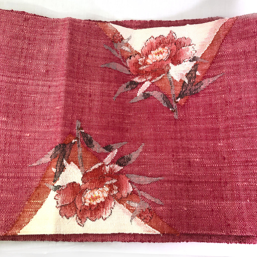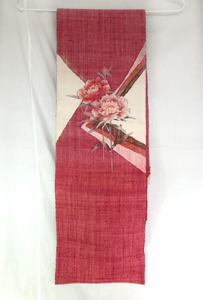 This one is made of roughly spun, thicker fabric in raspberry pink and cream colors. The point pattern depicts two peony flowers on a geometric background. A similar pattern is repeated at the other end of the obi.
