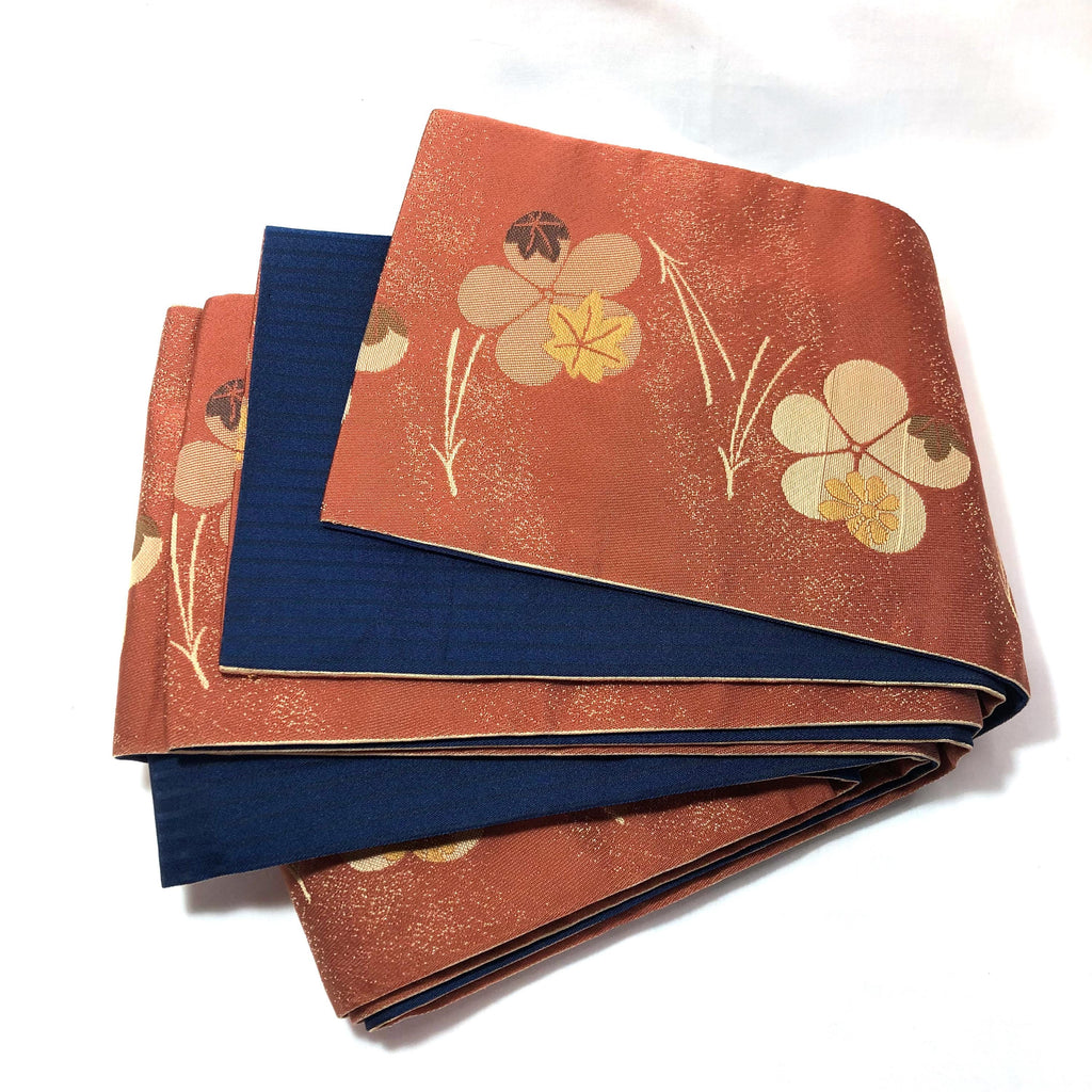 An elegant obi in contrasting shades. The top fabric is in orange-brown color, with simplified images of various flowers and foliage. The reverse side is in navy blue color, with some horizontal stripes.