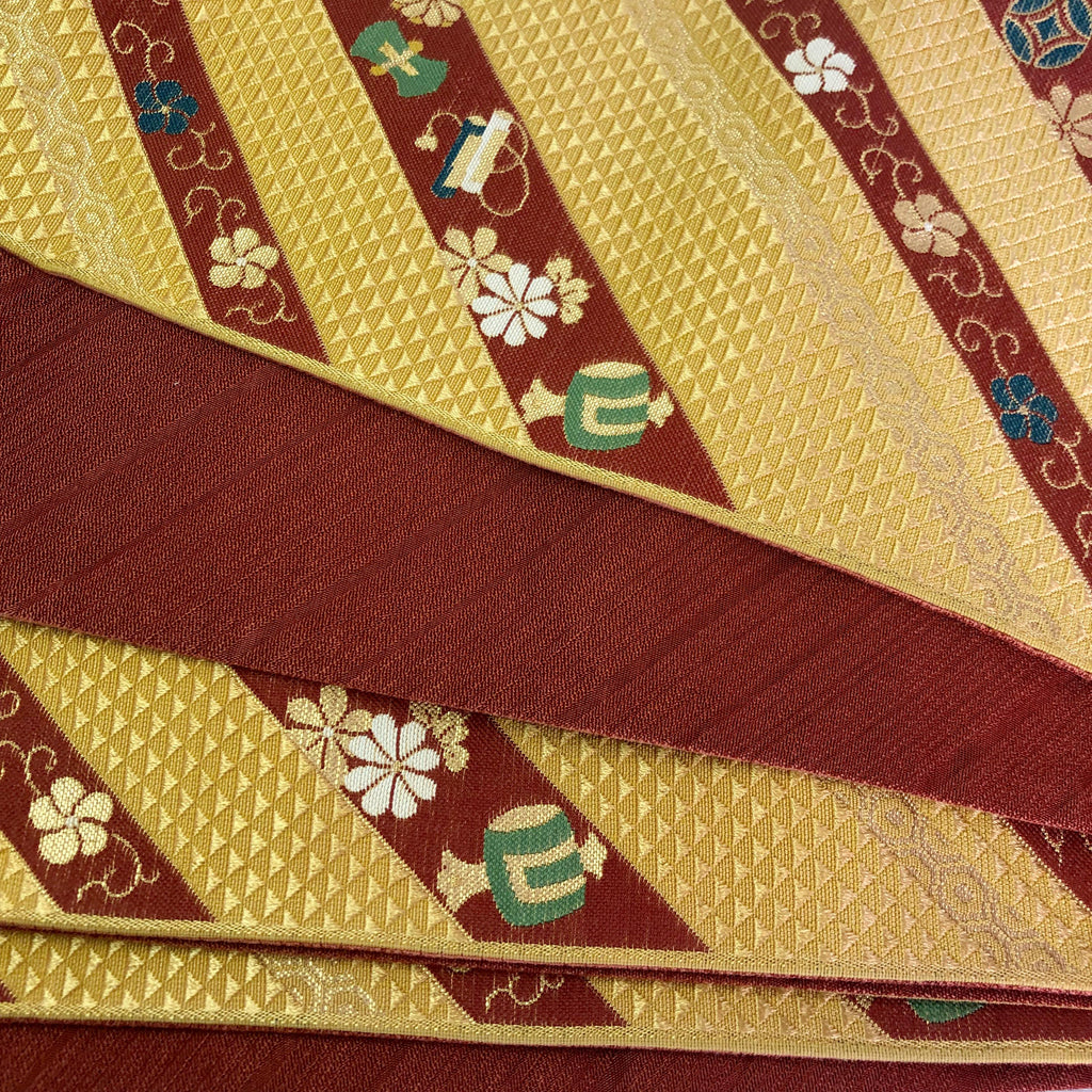 A lucky obi in contrasting shades. The top fabric is in ocher yellow color, decorated with red stripes filled with auspicious symbols. The reverse side is in brick red shade, with a delicate stripes pattern.