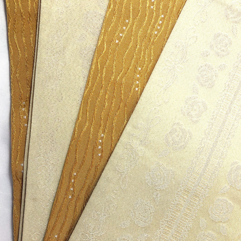 A cute obi in matching shades. The top fabric is in cream yellow, with a slightly textured rows of roses and ribbons. The fabric is decorated with a metallic thread. The reverse side is in an ochre yellow color, with a textured wave-like pattern, and some white accents.