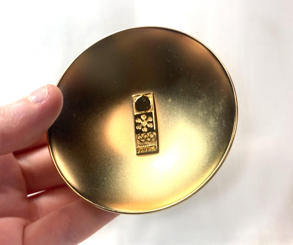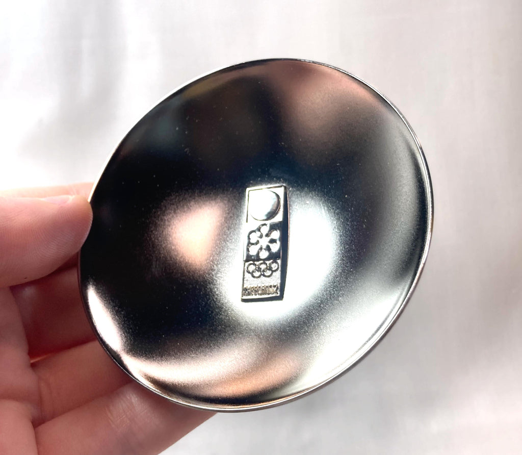 Set of two metal cups for drinking sake commemorating Sapporo Winter Olympics of 1972. The design and color resembles gold and silver medals.