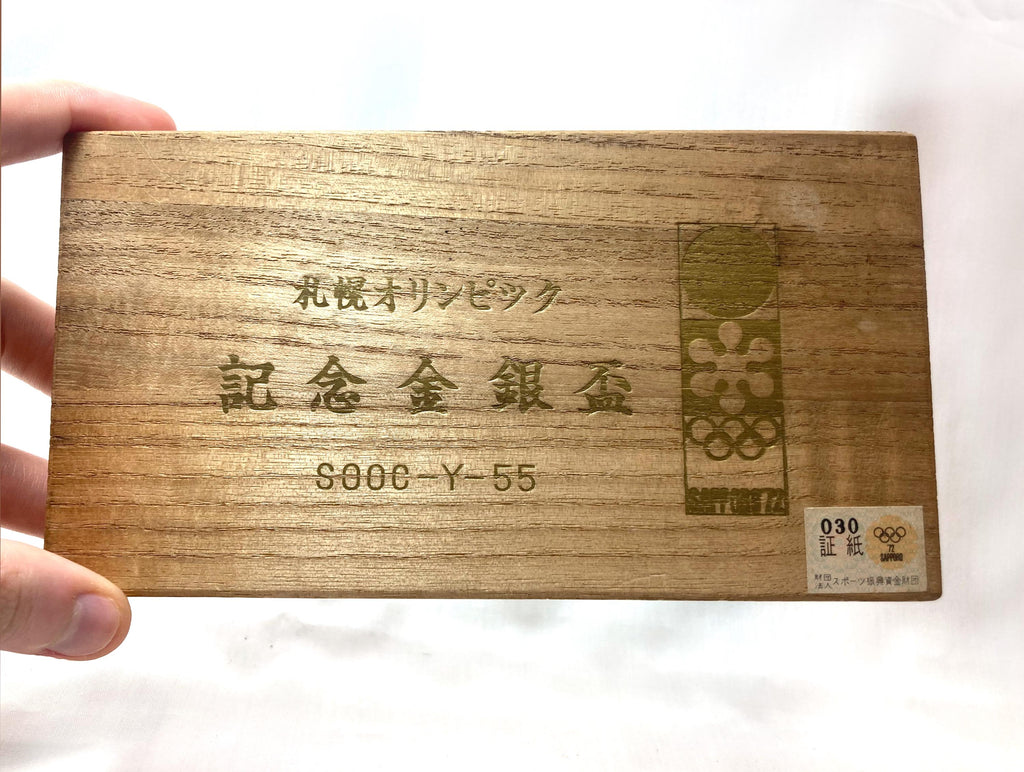 The set comes with its original wooden box, marked on the top with the name of the occasion and the item, as well as the logo of the Olympics, and an authentication seal.