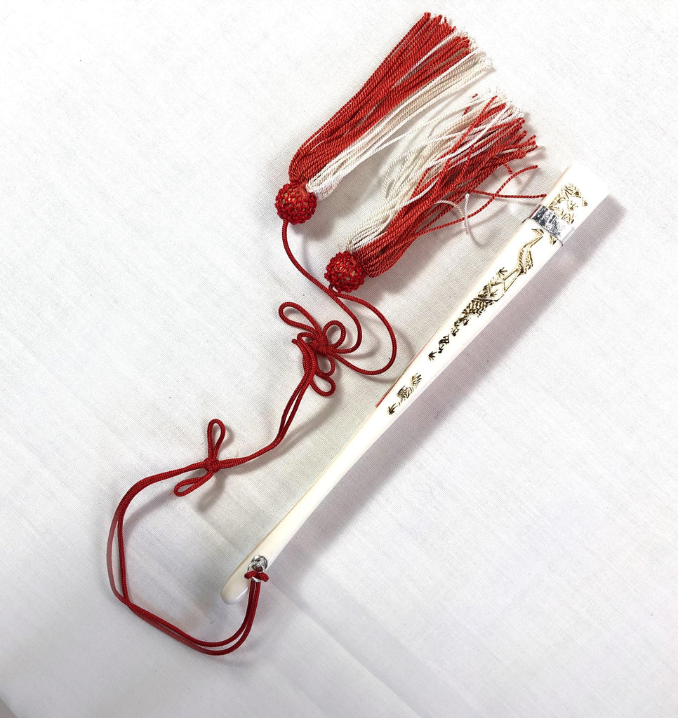 The set contains a thick obijime used to secure an obi, a foldable fan, a small wallet -like pouch, and a small metal ornament with a fabric sheath.