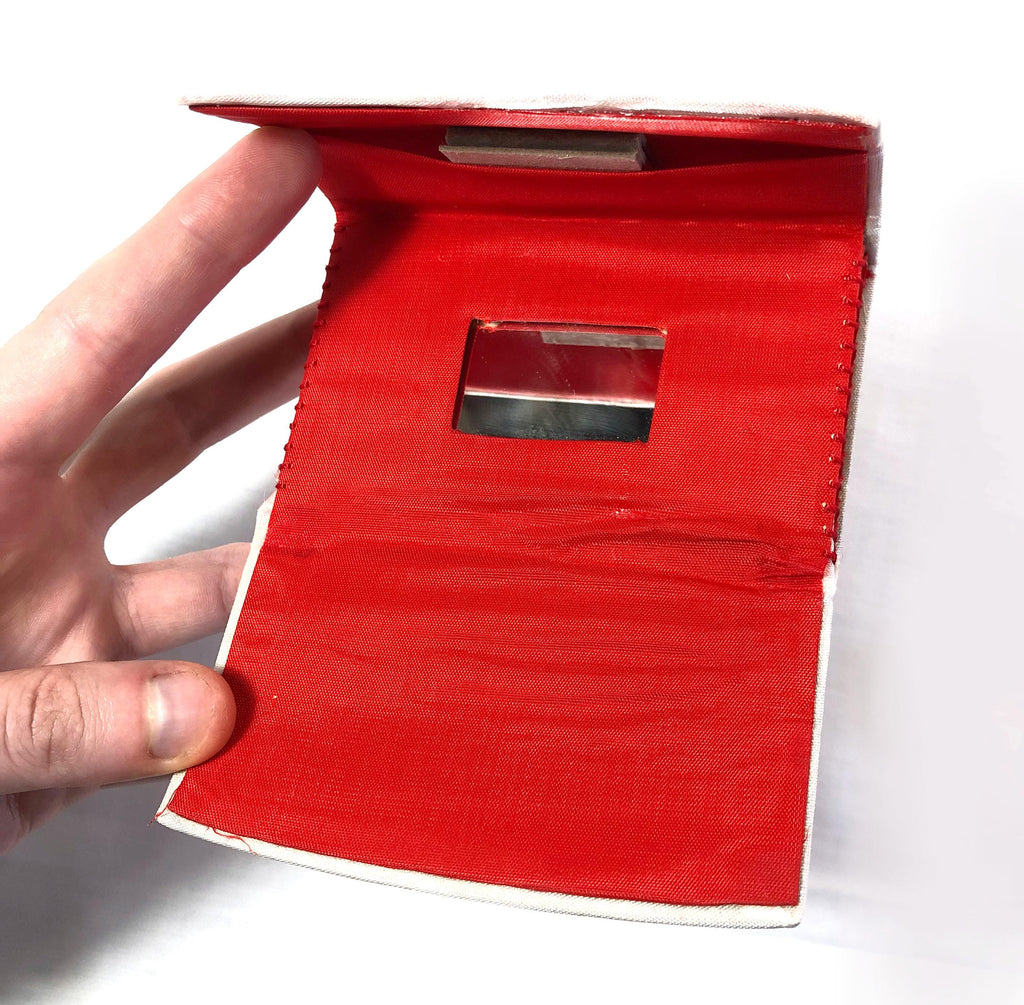 Due to its age, there are some light yellow stains on the fabric. The box lining is slightly damaged as well.