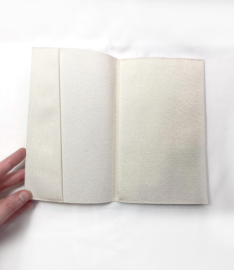 An elegant slip cover, used to carry important documents such as a wedding speech or envelopes with gift money. A sparkly light beige fabric is decorated with tiny silver sparkles and light blue billowing water pattern.