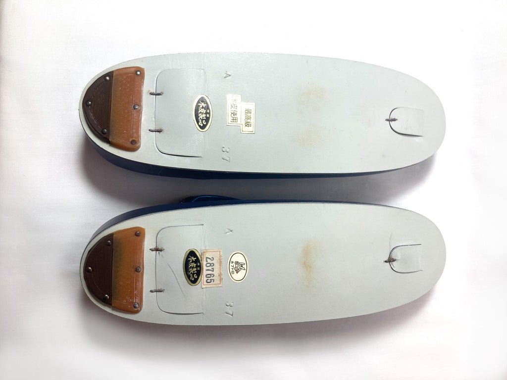 The shoe soles are made of leather. The pair seems to be barely used. The sides and tops of the shoes are in good condition. The metal parts on the soles are rusted. One bead is mismatched. Please review the photos carefully before making a purchase.
