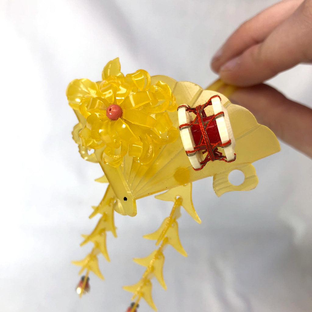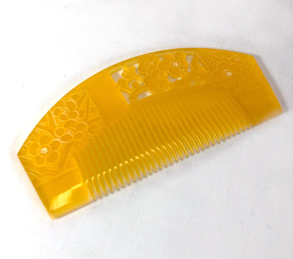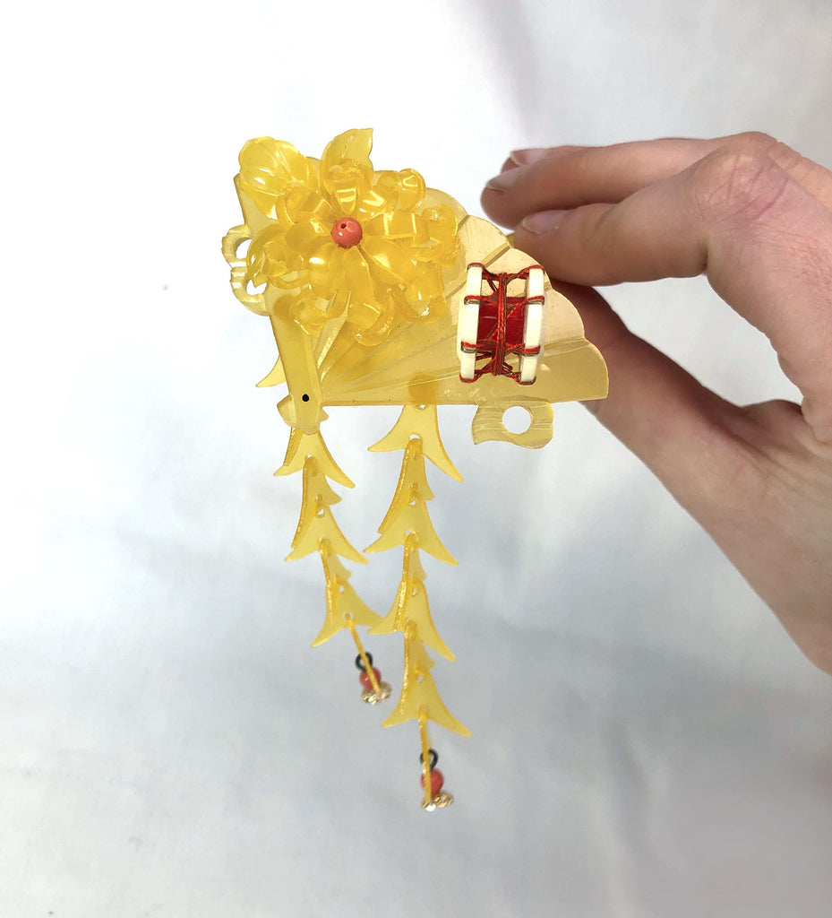 The comb is carved with images of plum blossoms. One hairpin features a 3D chrysathemum flower, and a small red hand drum. The second hairpin is decorated with two big flowers on a hand fan shaped backdrop. Bth hairpins have two rows of wisteria flowers hanging underneath. Each pin has two prongs, allowing for a secure wear. Semi transparent resin is in a pleasant, honey yellow shade. Beads recemble coral.