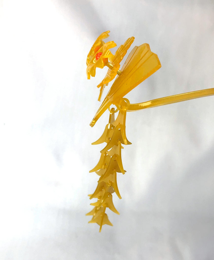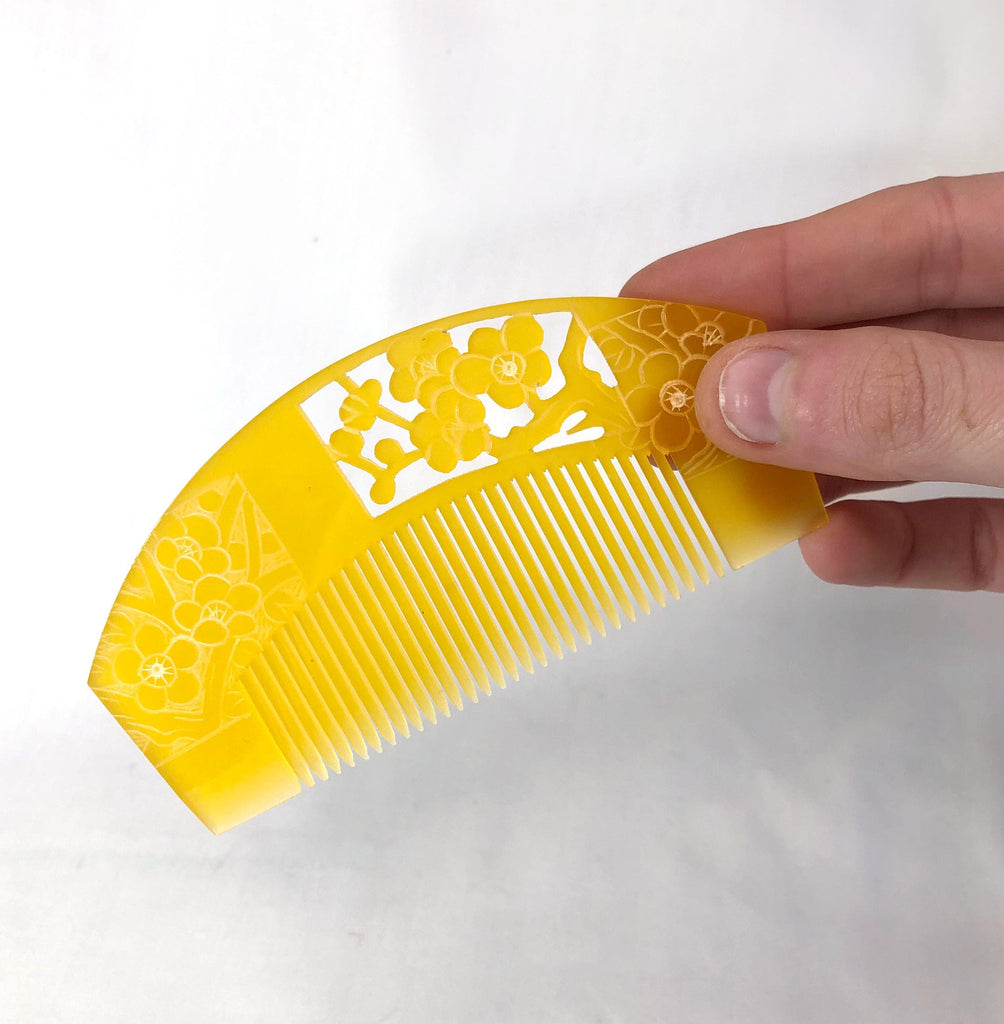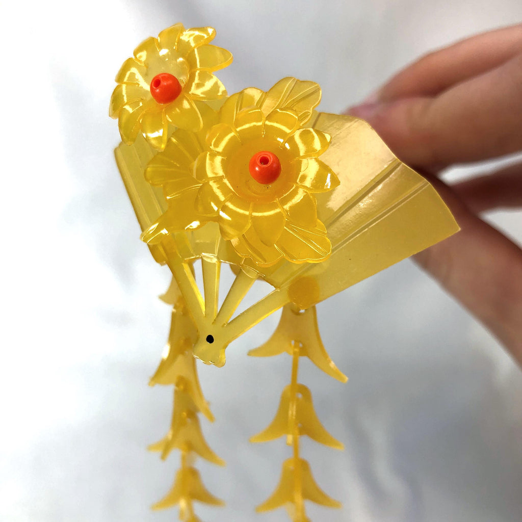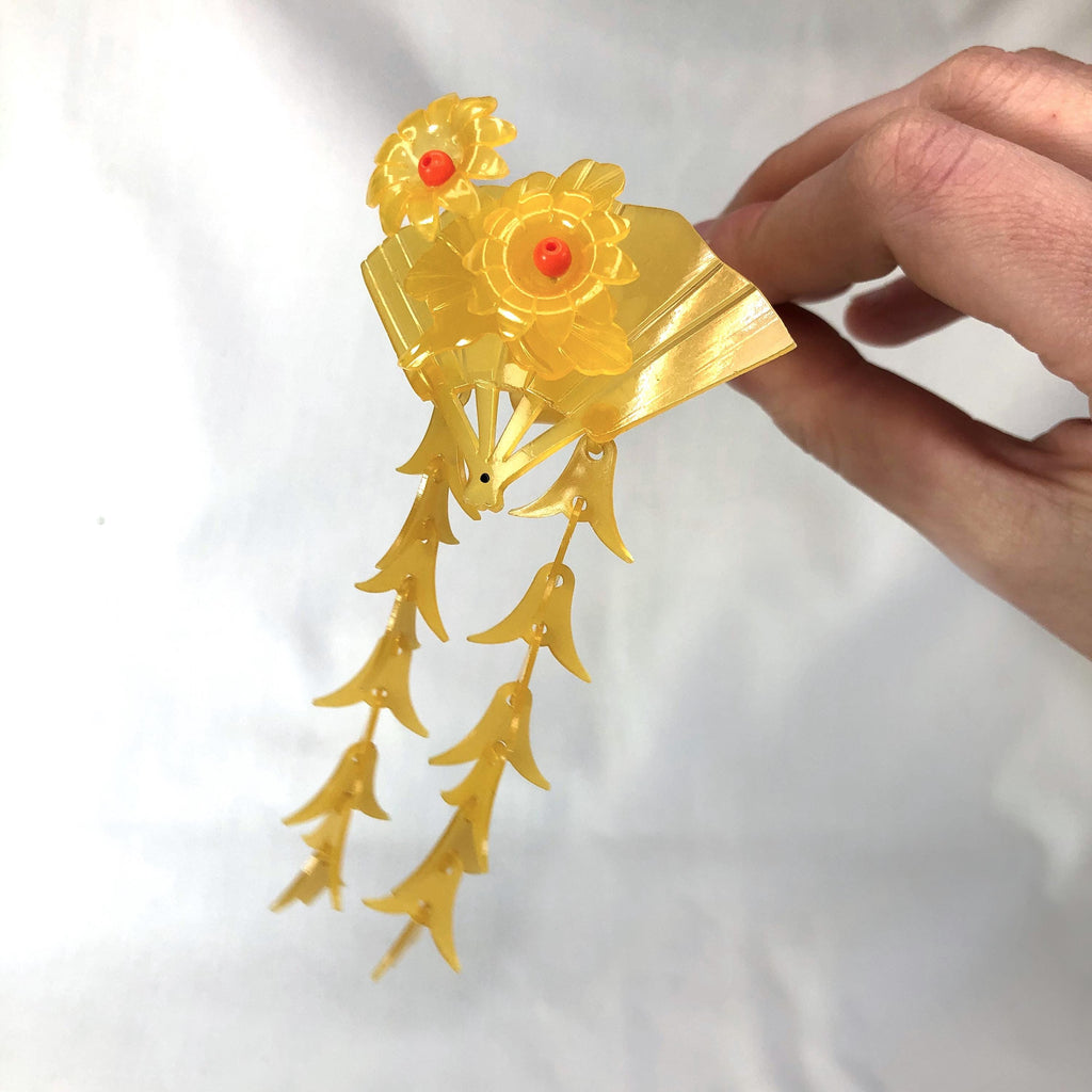 The comb is carved with images of plum blossoms. One hairpin features a 3D chrysathemum flower, and a small red hand drum. The second hairpin is decorated with two big flowers on a hand fan shaped backdrop. Bth hairpins have two rows of wisteria flowers hanging underneath. Each pin has two prongs, allowing for a secure wear. Semi transparent resin is in a pleasant, honey yellow shade. Beads recemble coral.