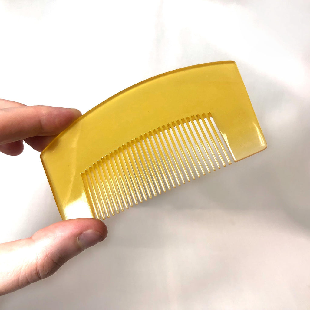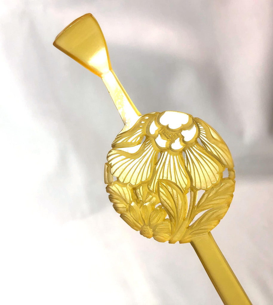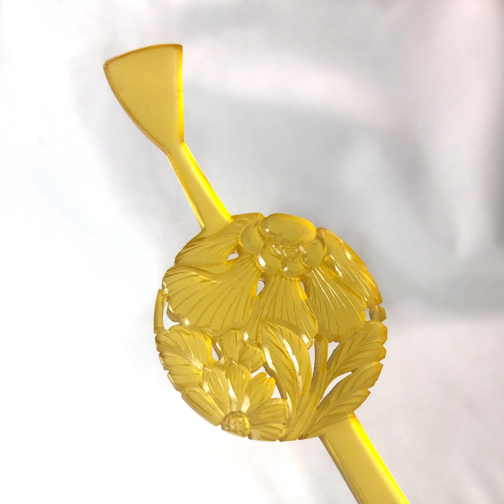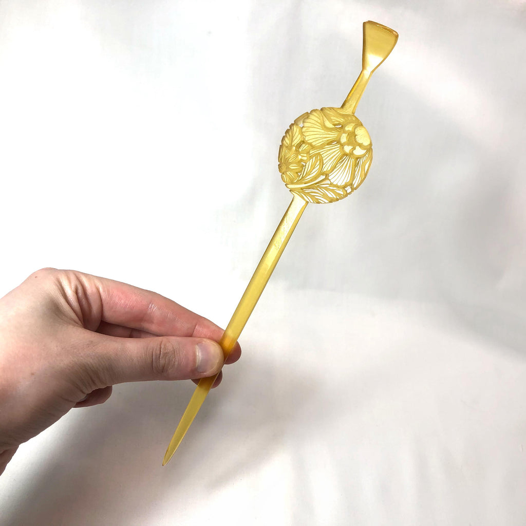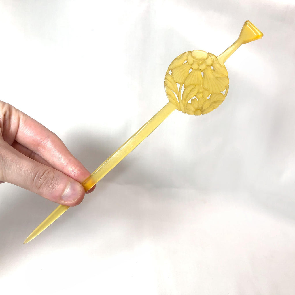 One hairpin features a simple knot; another is decorated with an openwork floral motif. The third item is a long bar, thinner in the middle. In the set, there is a simple flat comb included as well. Semi transparent resin is in a pleasant, honey yellow shade.