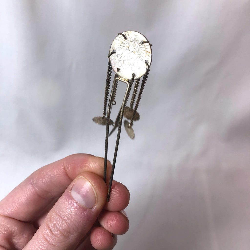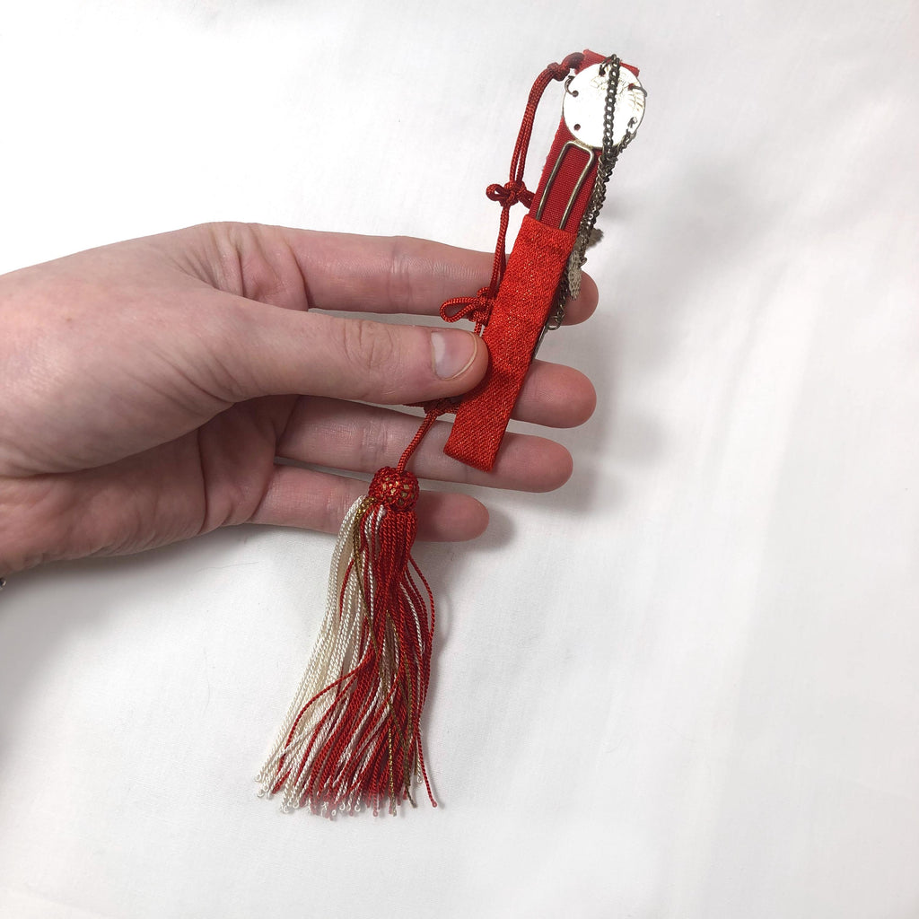 The set consist of a wallet-like pouch with a small mirror build inside and a mini fragrance pouch charm, and a decorative tin pin in a sheath with tassels. Such pin can be used as a hair decoration, while its cover is stuck between layers of the obi, providing additional decoration to the outfit. The fabric is decorated with images of crane birds, symbols of luck and longevity.