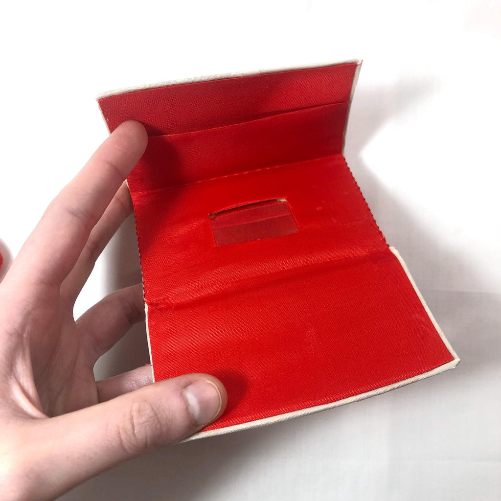 There are multiple tiny yellow stains on the white parts of the fabric. There is a small rip in the piping around the mirror pouch. The pin is tarnished and slightly bent, and is missing one of the dangling charms. Please refrain from purchasing if you are looking for a brand new and perfect item. Thank you for your understanding.