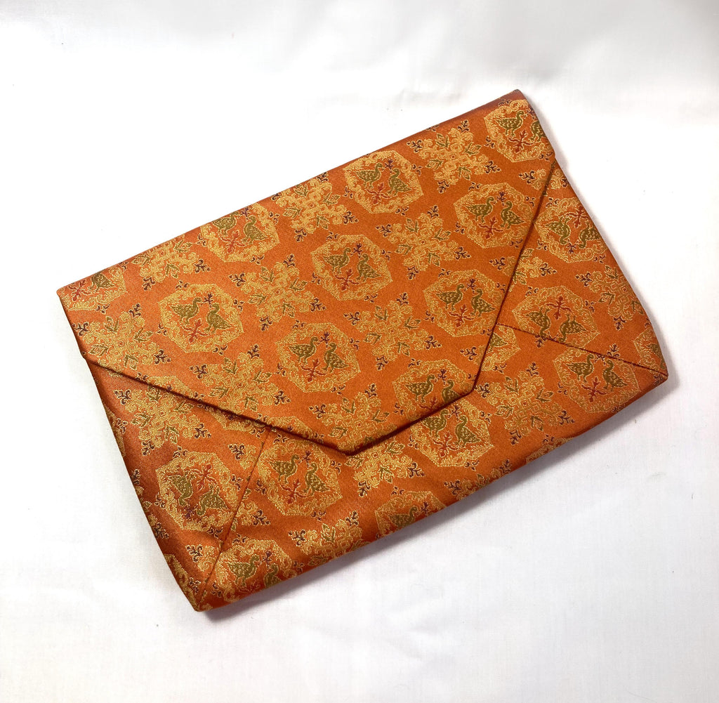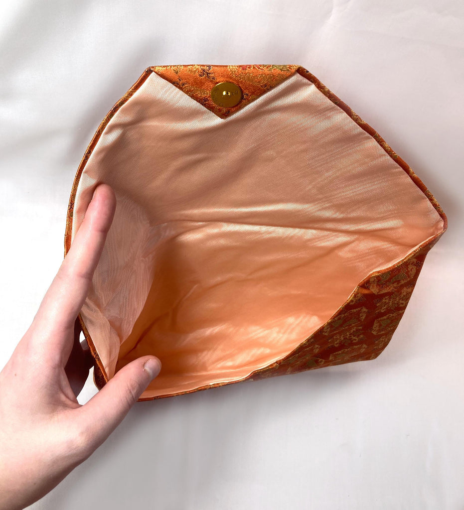Top fabric is made of vivid orange fabric, with a light yellow, red, and green tile - like pattern with some floral and animal motifs. It closes with a snap button.