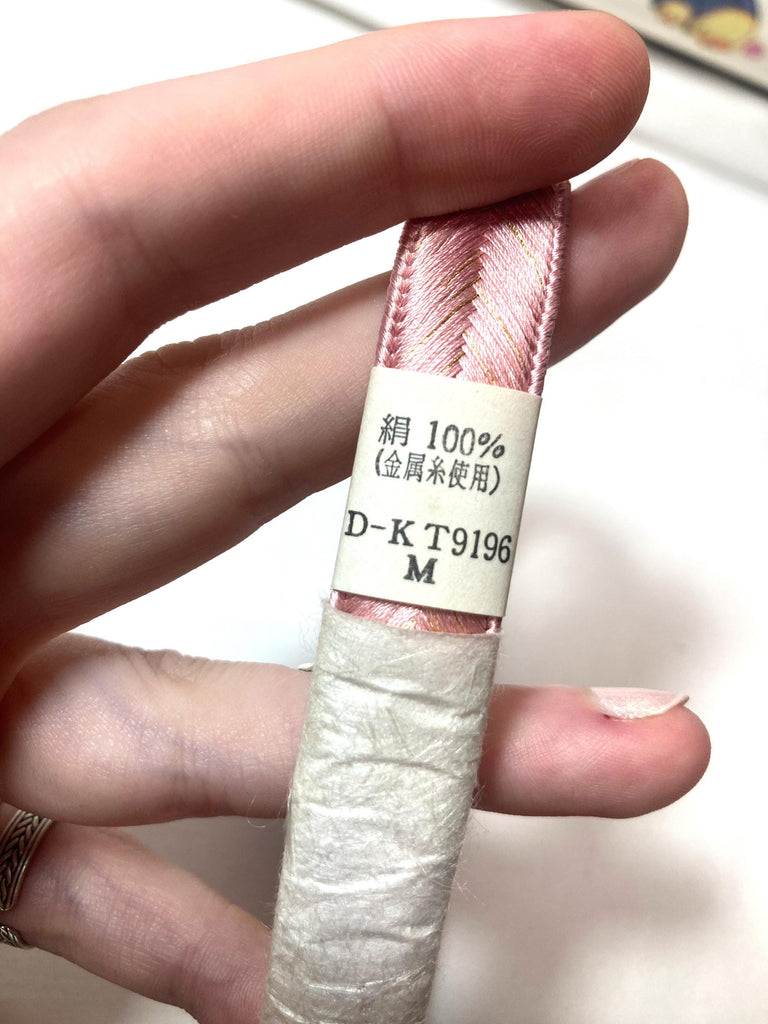 The set contains an obiage - a long sash-like strip of fabric used among many other items to tie an obi, and an obijime - a rope used to hold and decorate obi sash.