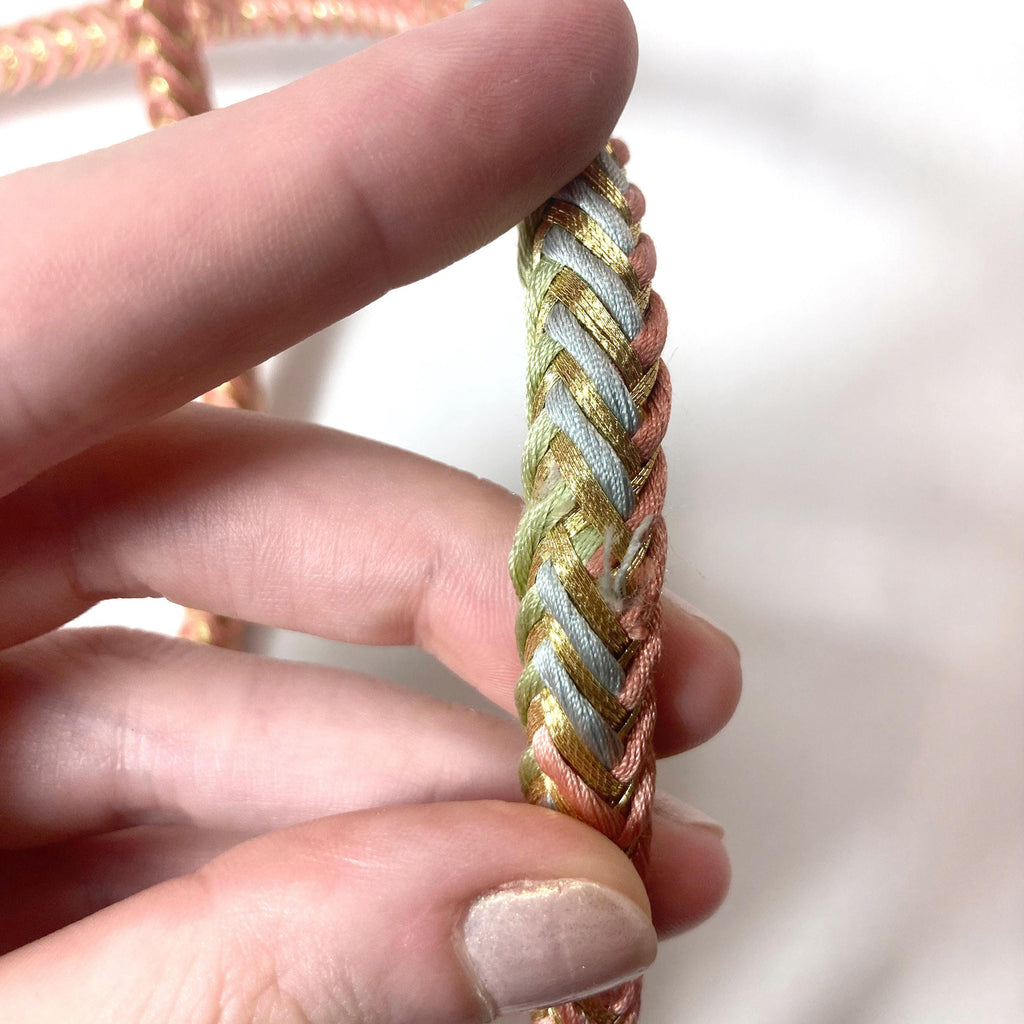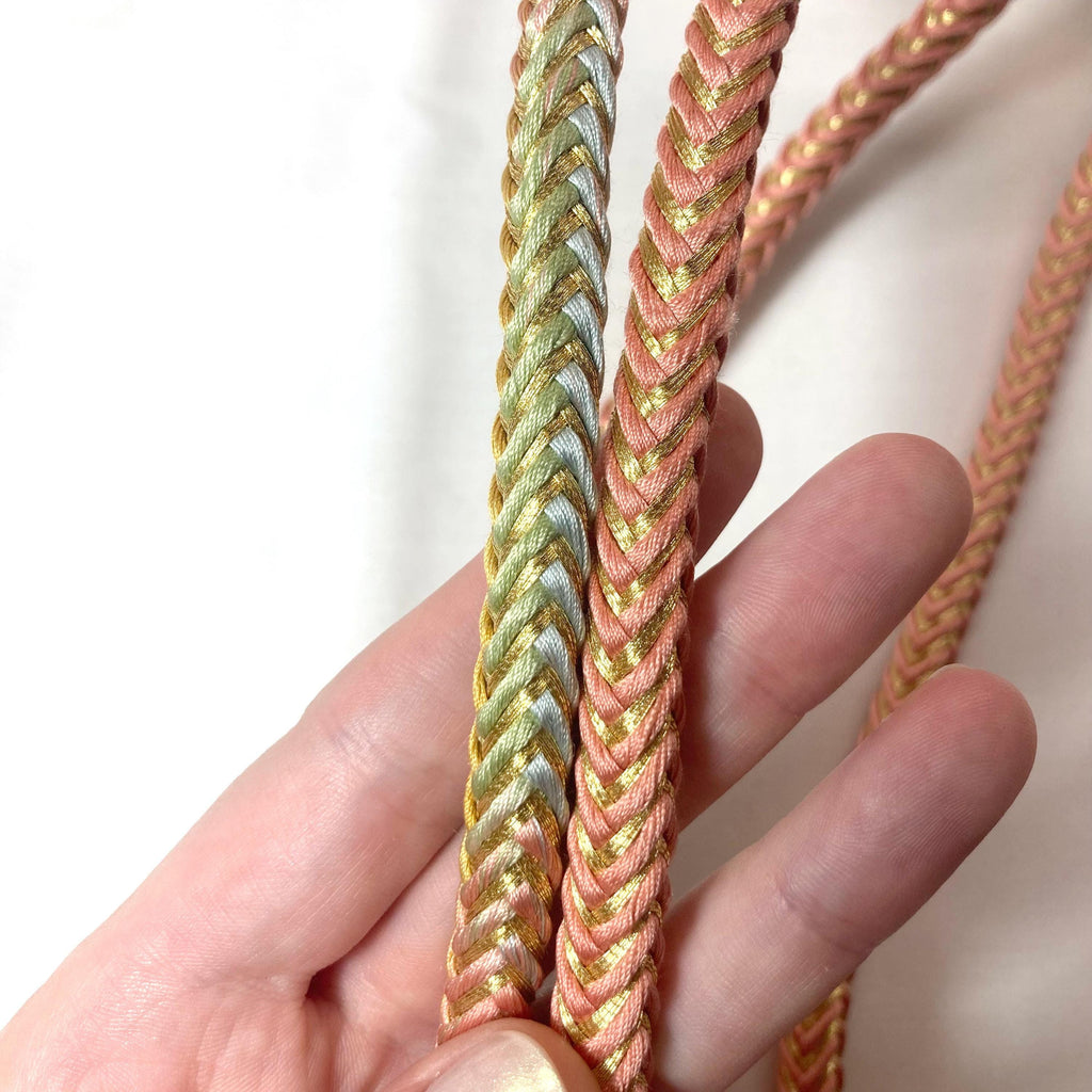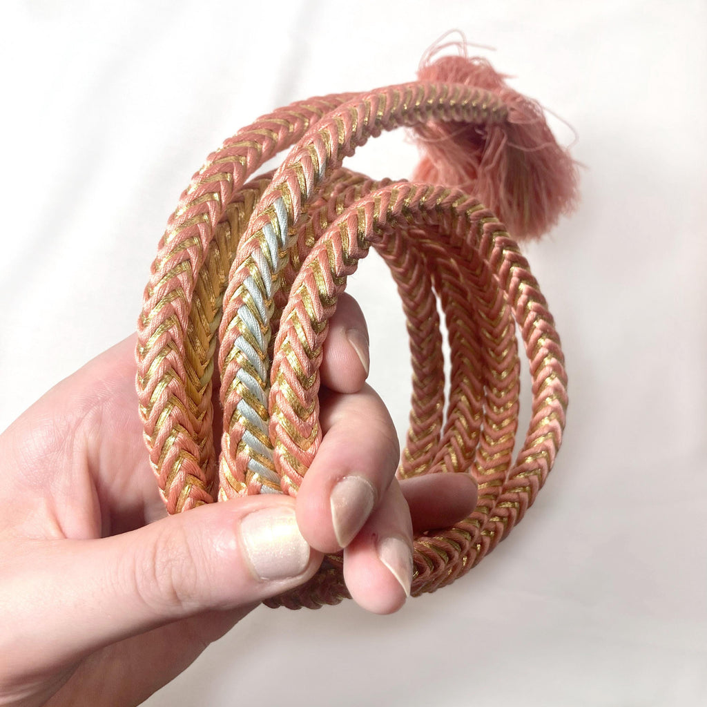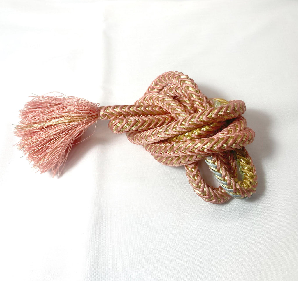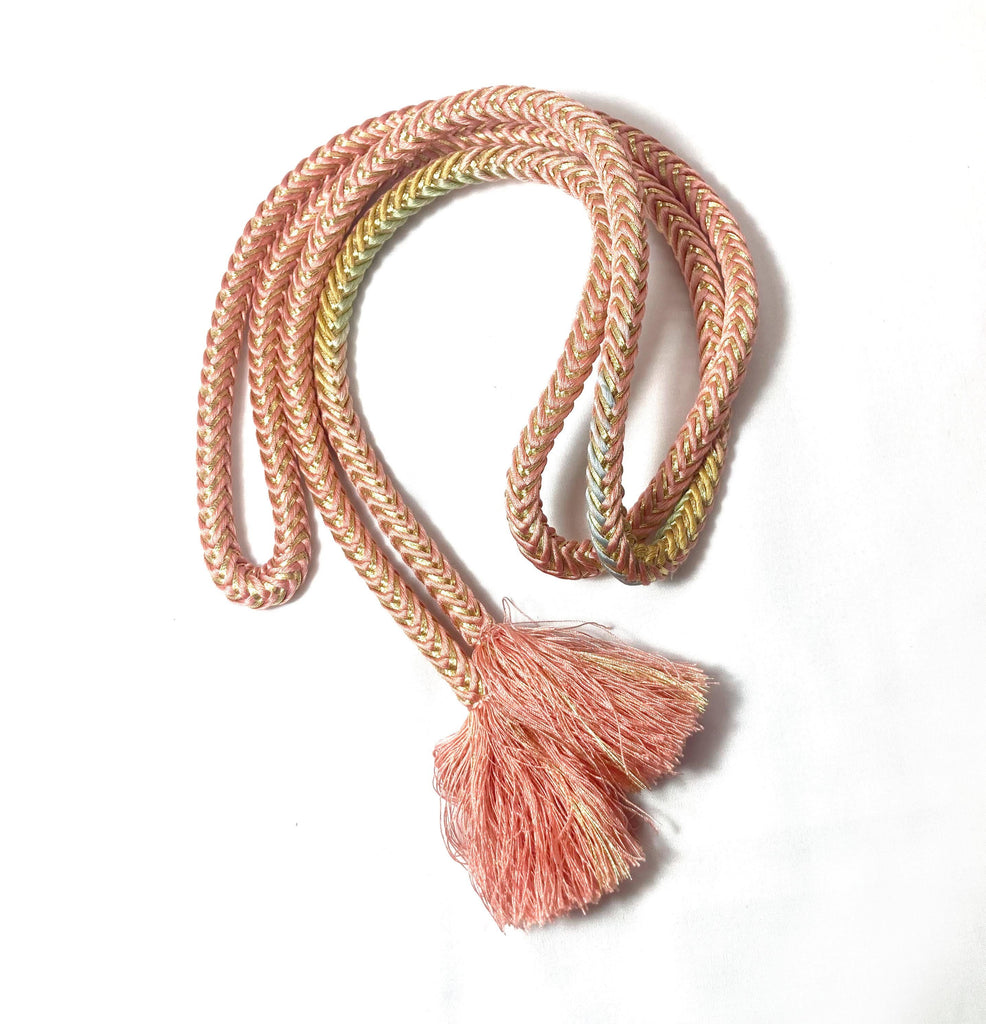The set contains an obiage - a long sash-like strip of fabric used among many other items to tie an obi, and an obijime - a rope used to hold and decorate obi sash.