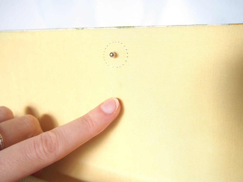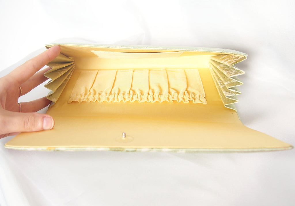 Rigid, with two small pockets inside. Lined with light yellow fabric. Due to the age, the lining is stained with minuscule yellow spots. There is also a spot of discoloration on the back of the bag. Please check the two last photos for the details.