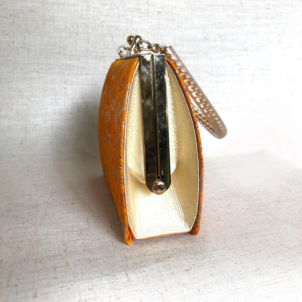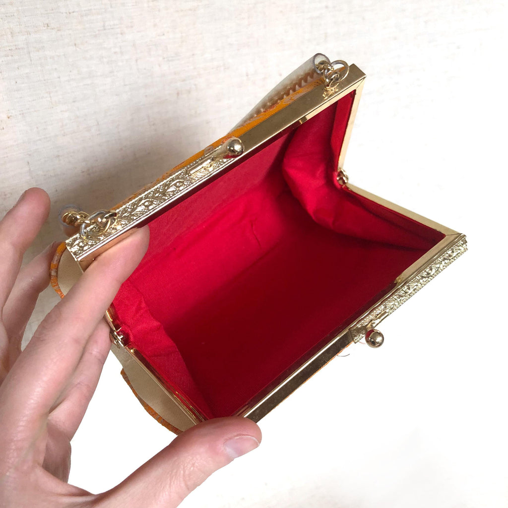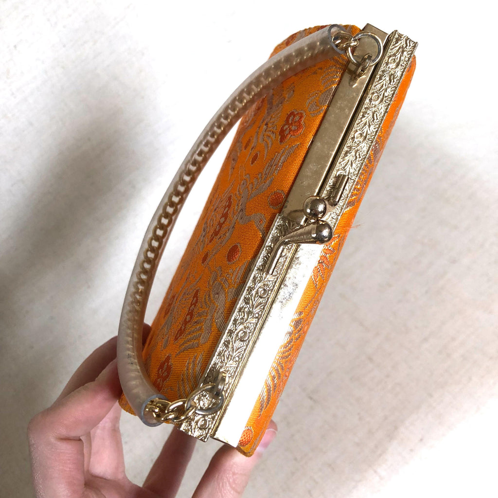 Cute bright orange and golden handbag, on short chain strap. The repetitive pattern shows crane birds -symbols of luck and longevity, and "three friends of winter" - plum, bamboo, and pine tree. Finished with metallic thread.