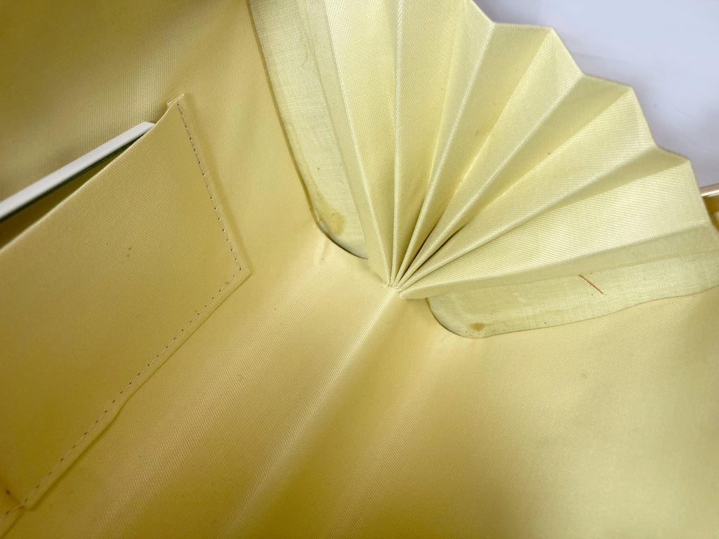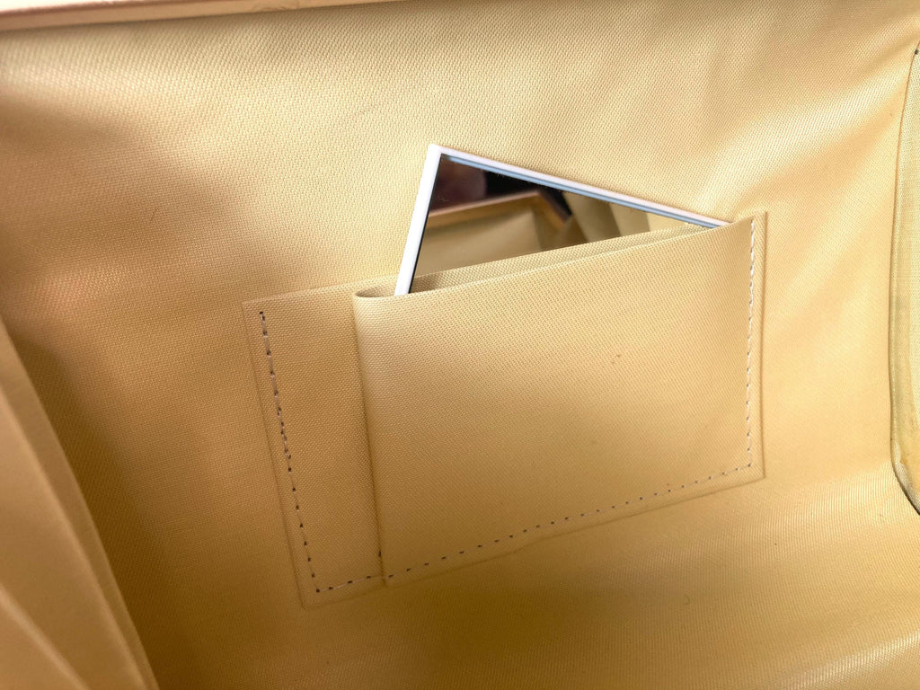 The interior of the bag is in a light yellow color. There is a small pocket inside, containing a mirror.