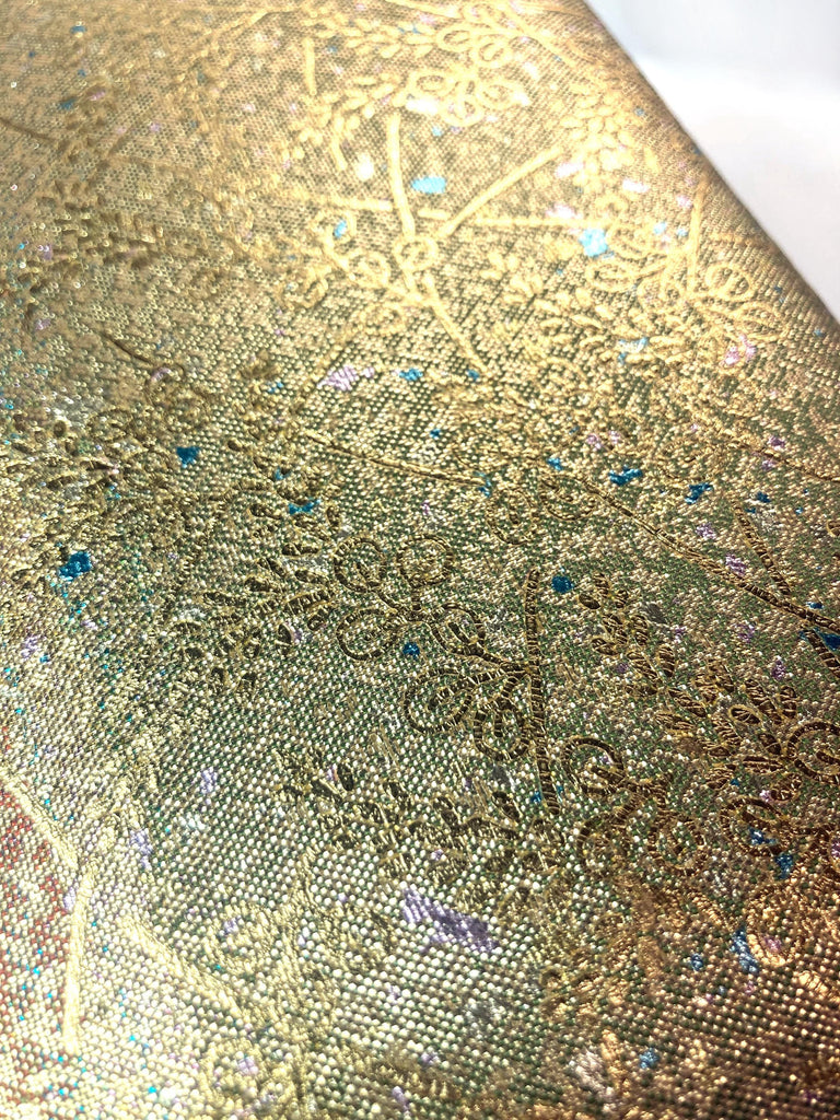 This one is made of metallic fabric with a delicate golden decoration and holographic spots. Both sides are adorned with a pattern printed with thick metallic paint, on an orange and green gradient background. The sides are in a light golden shade.