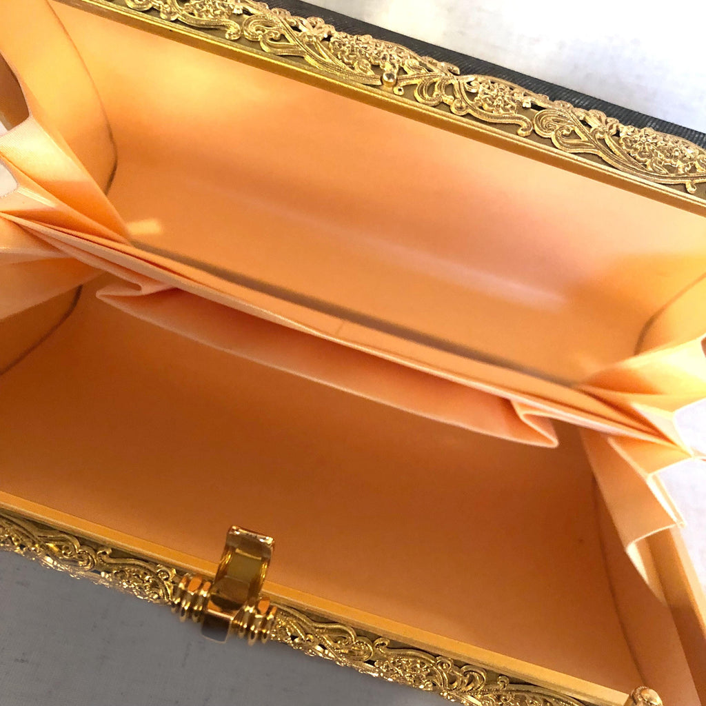 The metal parts are in a gold color, decorated with intricate floral pattern.