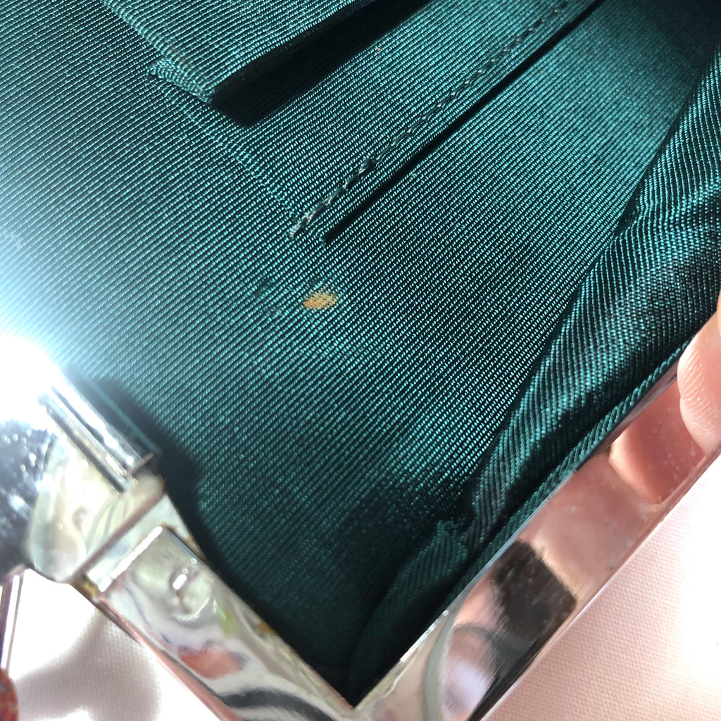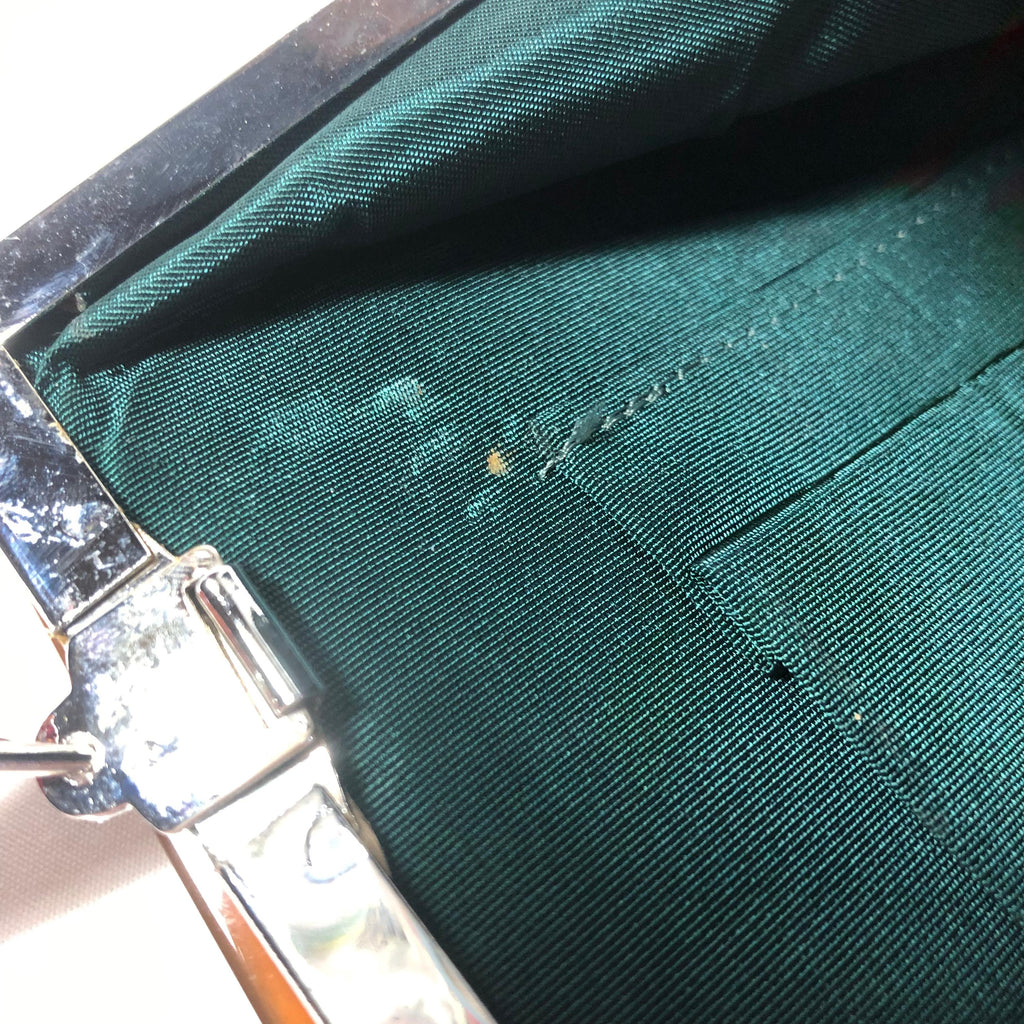 The lining is in deep green color. There are two small pockets inside, one containing a tiny mirror. It has slightly chipped edges, due to its age. The main compartment will fit a smartphone and a couple of other personal items.