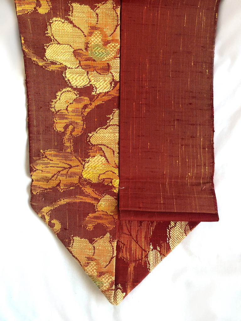 An eye-catching colorful Nagoya obi. It's the most popular obi type - it's partially folded, allowing for easier tying. It is usually tied into a simple "taiko musubi" knot.