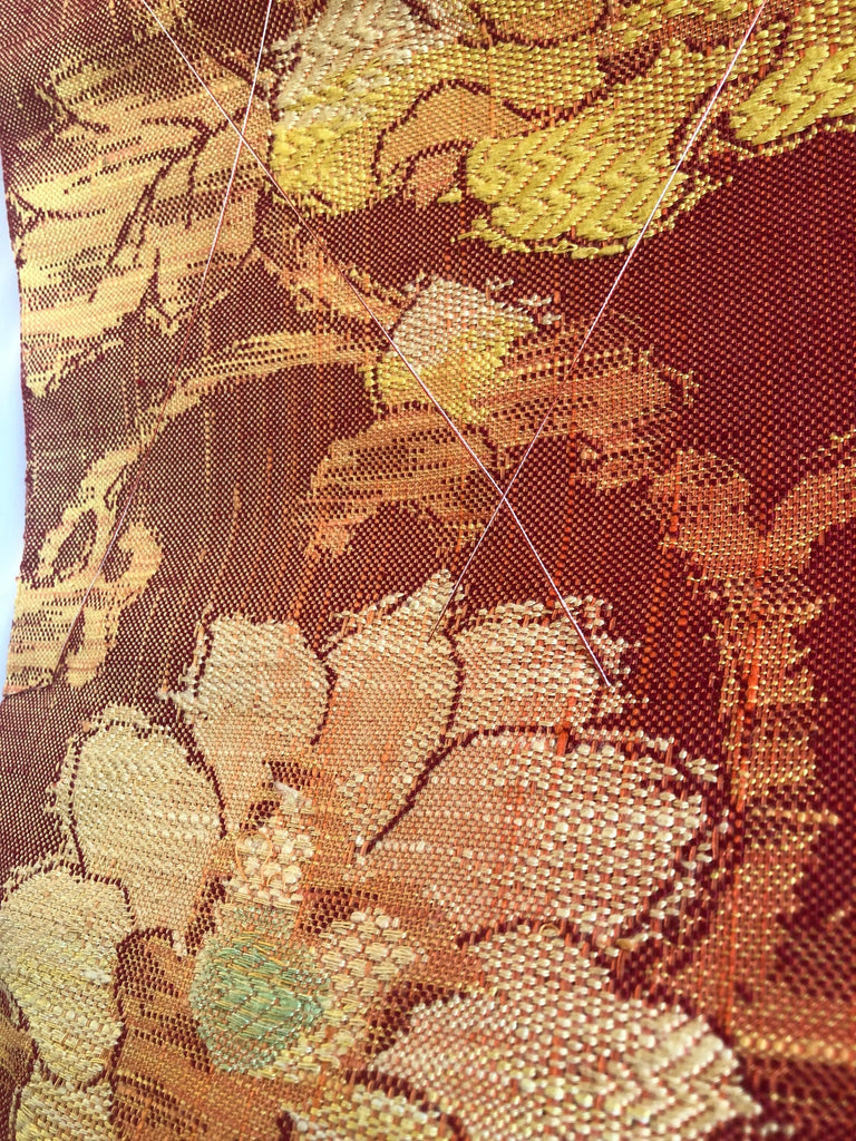 This obi is still having its basting stitch in, which means it is unused. It is made of textured fabric. The woven pattern show yellow, orange, and green stylized floral motif. The background shows yellow-orange and red-orange gradient.