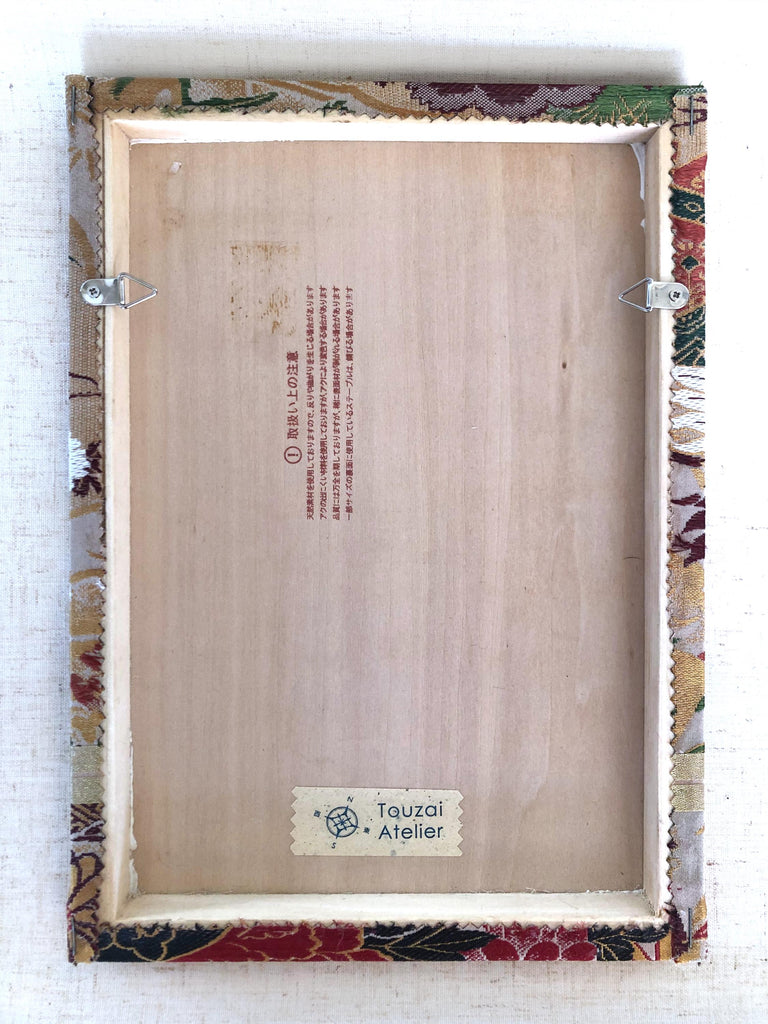 Authentic obi fabric stretched on a wooden panel. A matching ribbon for hanging is included.